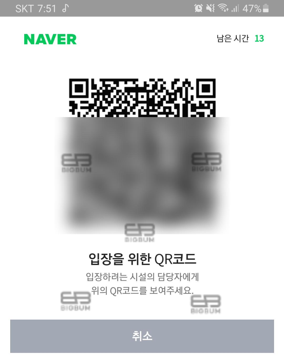 ③ 개인(본인) QR코드 화면이 나오게 되고, 입장하려는 시설의 담당자에게 해당 QR코드를 보여주어 스캔 확인 후 입장할 수 있다.