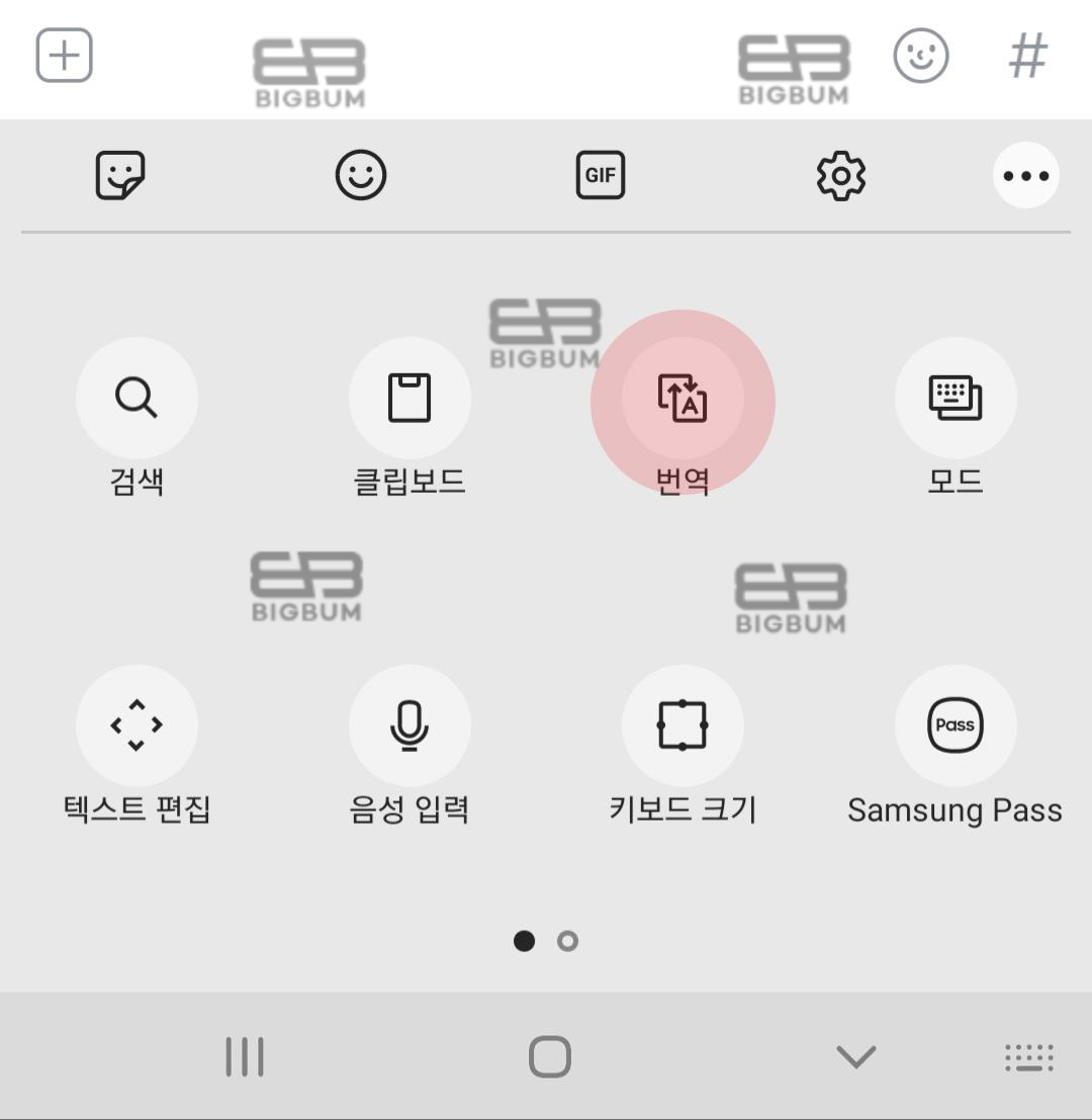 ② 점선(더보기) 아이콘을 클릭하면 메뉴가 펼쳐지는데 이곳에는 검색, 클립보드, 번역, 모드, 텍스트 편집, 음성 입력, 키보드 크기 등 다양한 메뉴가 존재한다. 여기서 번역 아이콘을 클릭한다.