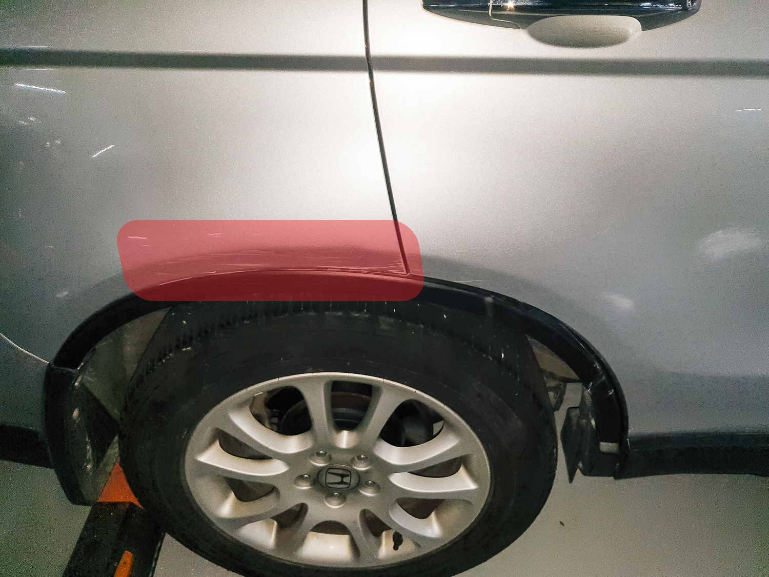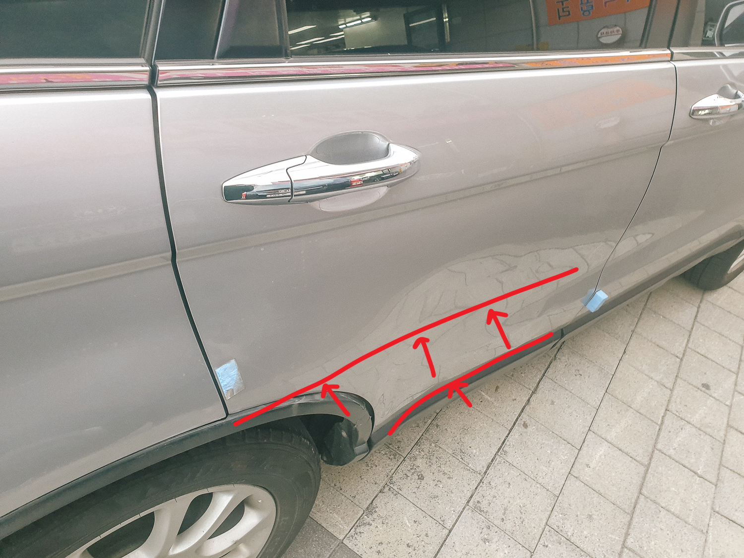 작업은 도어쪽 면만 작업할 예정이었고, 도색은 하지 않고 덴트 작업만 하였다. 바퀴 쪽 뒷면에 스크래치는 도색하는 개념으로 접근해야 하기 때문에 일단 작업면에서 제외시키기로 하였다.