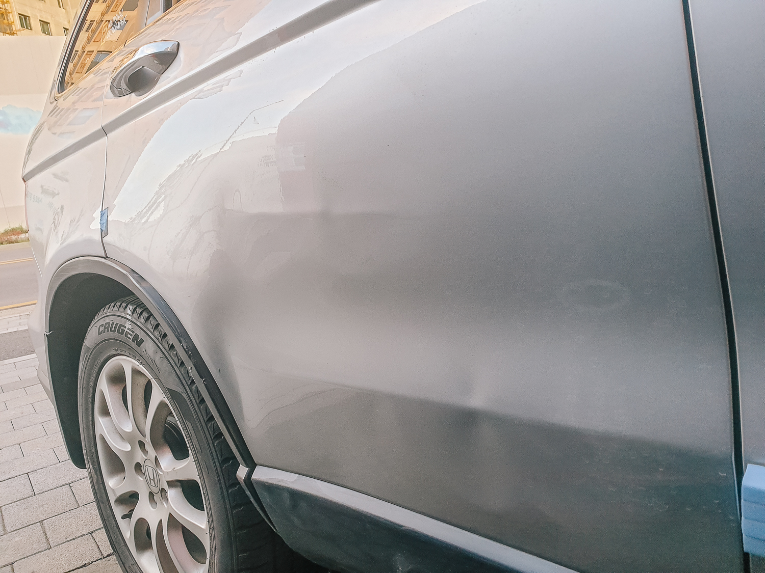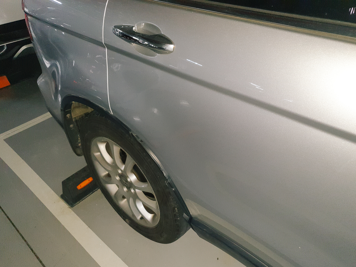 이 사진이 뒷좌석 도어가 상한 모습이 제대로 보여지는 듯하다. 정중앙에 가로로 선이 있는데 도어 프레임 부분이다. 얼마나 기둥을 쓸면서 지나갔으면 저렇게까지 파였는지... 속상할 따름이다 ㅠㅠ 혼자 급하게 도어를 닦고, 스크래치 묻은 부분은 물파스로 지웠지만 휘어짐의 모습은 지울 수가 없었다.