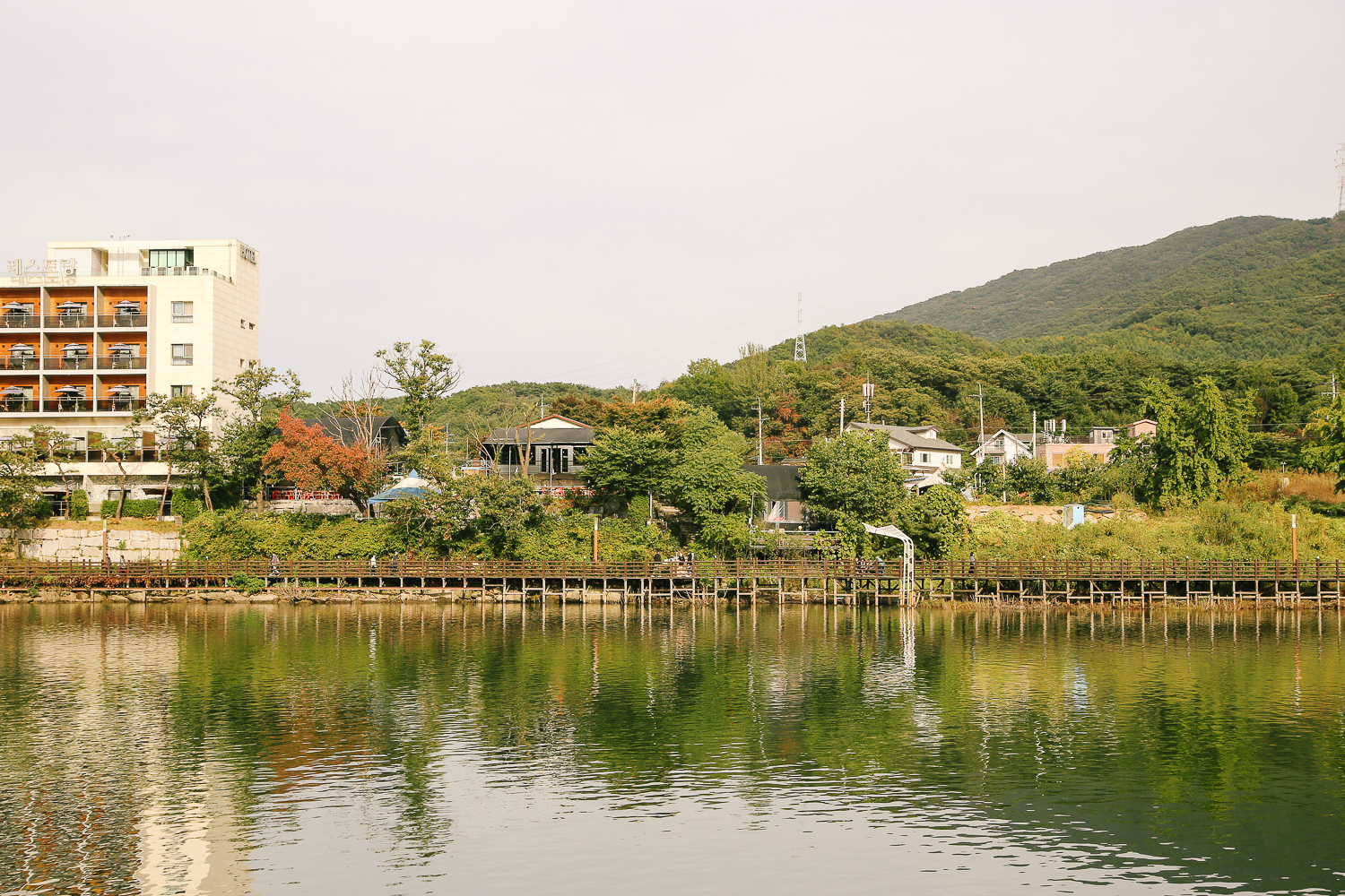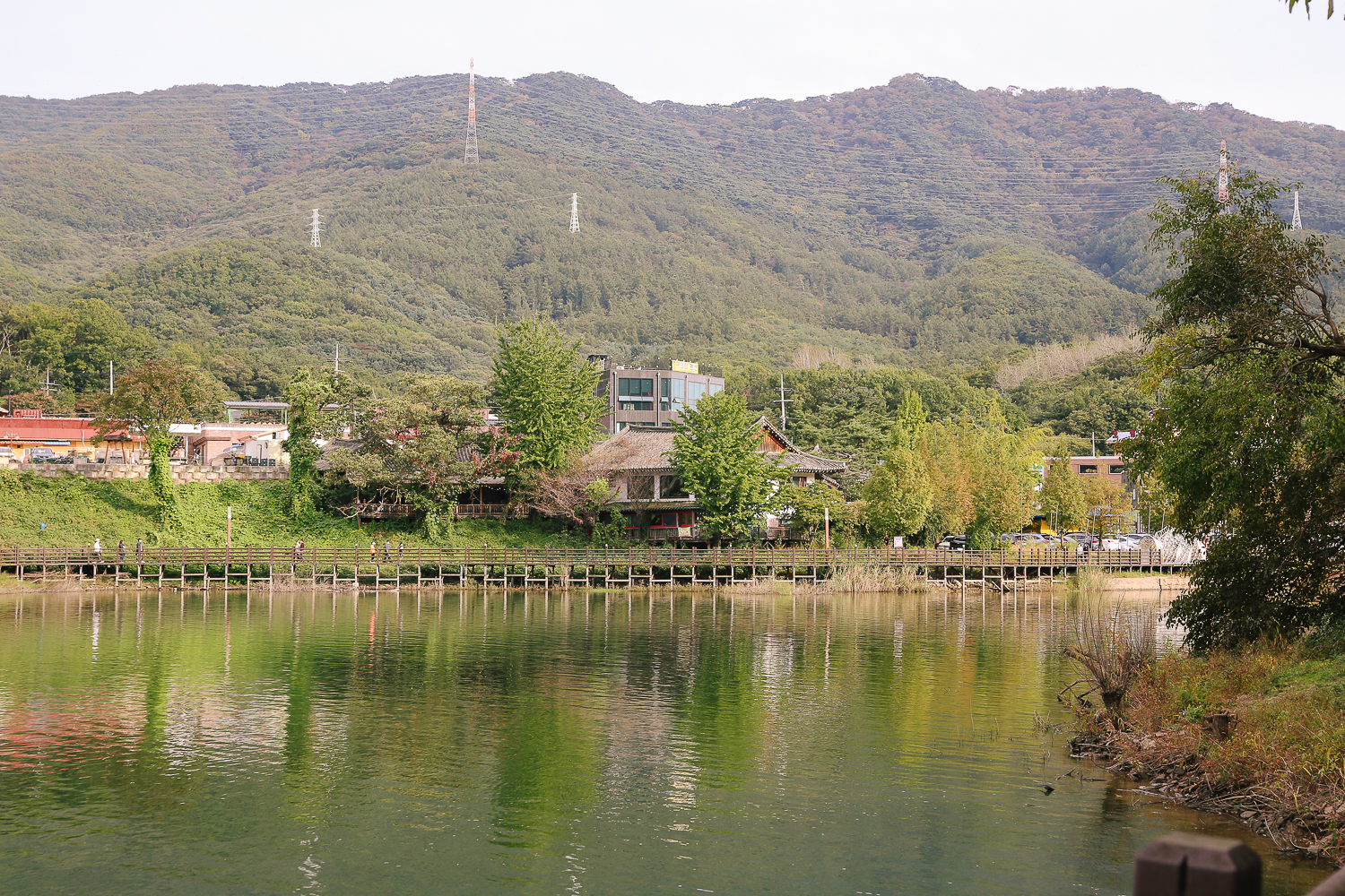 우리가 다녀왔던 한옥 부용원 카페가 보인다. 저수지의 잔잔한 물결에 비치는 모습이 꽤나 인상적이다. 적당히 우거진 나무와 뒤에 듬직하니 자리한 죽엽산이 정말 멋졌다.