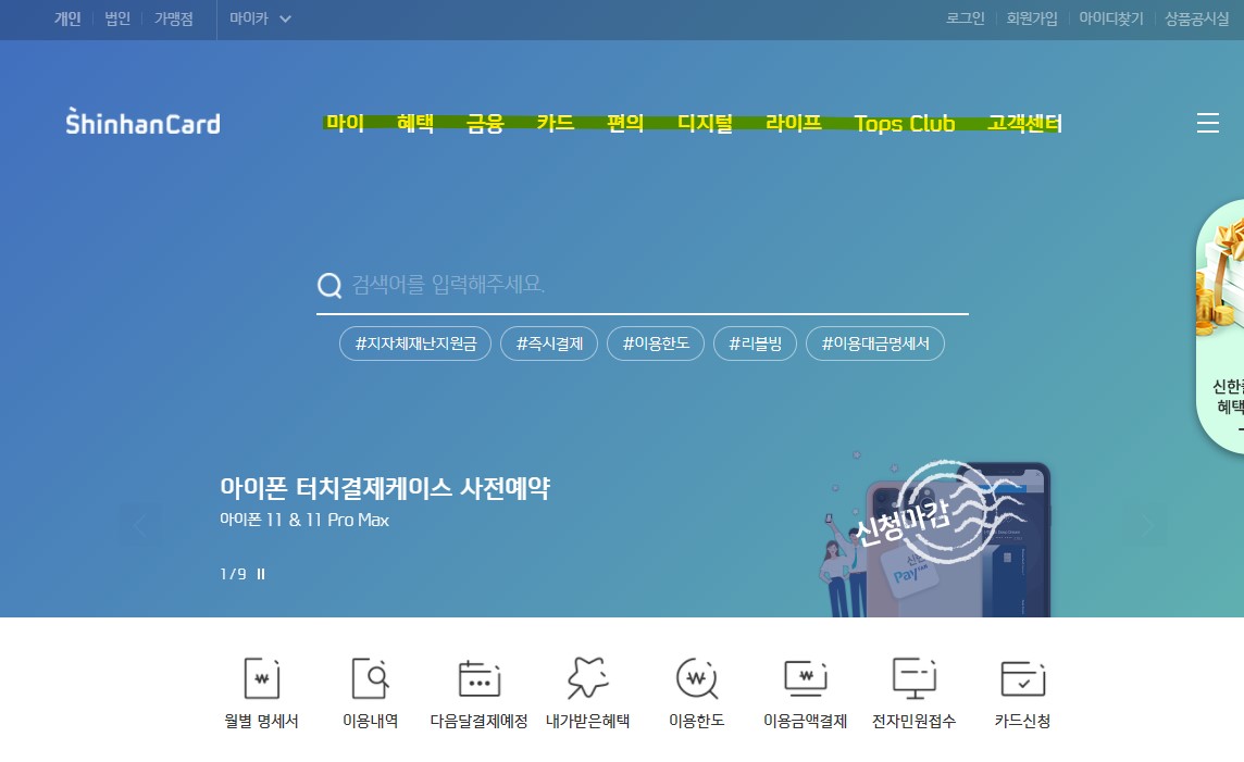 ① 신한카드 홈페이지 접속 후 로그인을 한다.