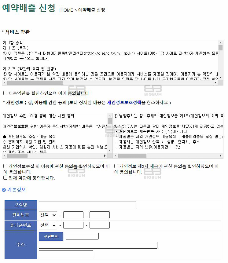 ②이용약관에 대한 동의 체크 및 정보 입력(배출일자, 배출장소, 기본정보 등)
