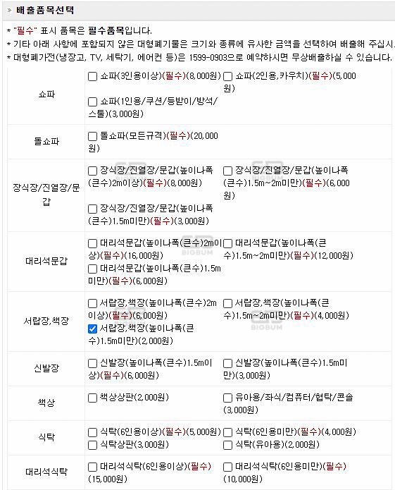 ③ 대형폐기물 품목은 정말 다양하다. 그중 내가 버리려는 것은 서랍장이었기 때문에 해당 규격에 준수하는 크기로 체크. 이미지에 체크된 것은 필수가 아니라 다음 단계로 넘어가지 못했고, 한 단계 높은 필수란을 체크하여 다음 단계를 넘어갔다.