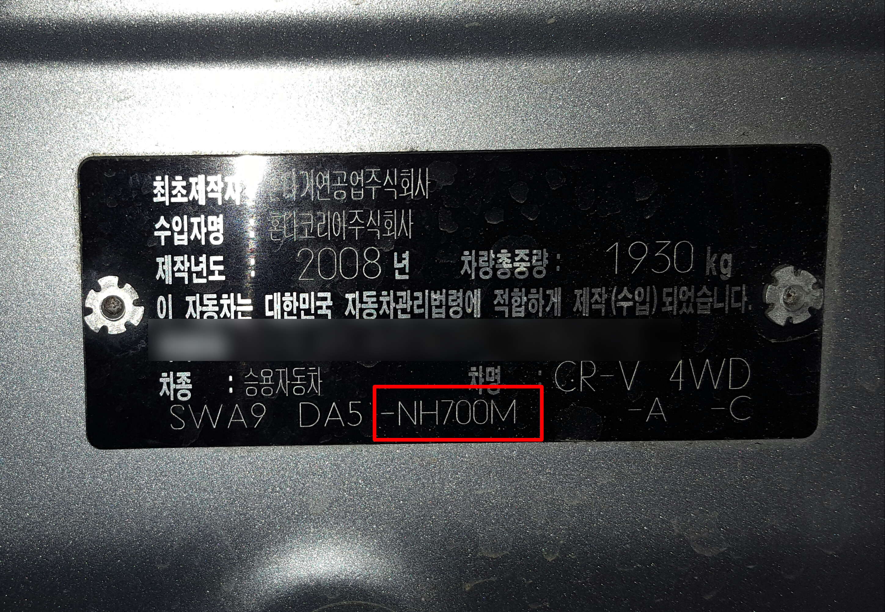 10월 초에 주차장 기둥을 긁으면서 뒷도어 일부가 스크래치가 난 상태로 붓 페인트를 주문하였다. 모든 자동차 페인트는 고유의 코드가 있는데, 이 코드를 모른다면 운전석 도어 겹치는 부분에 보면 차대번호와 차종, 페인트 코드를 확인할 수 있다.