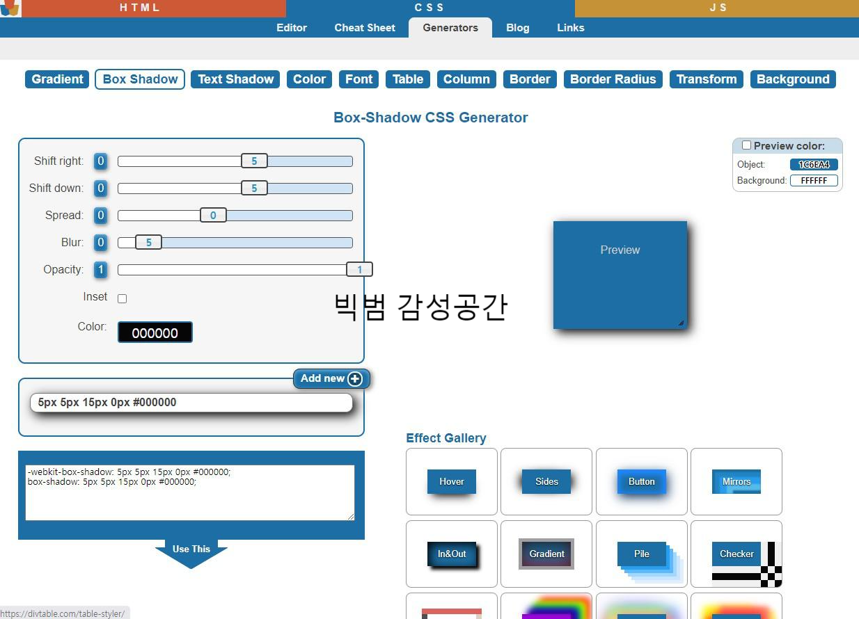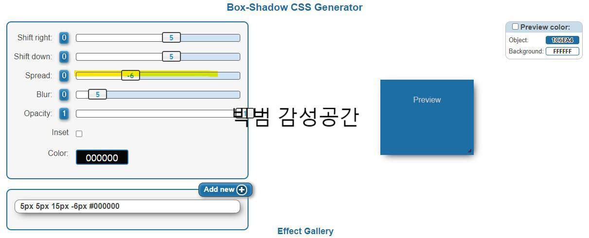 HTML 스타일을 줄 때 box-shadow 나 text-shadow의 그림자를 정교하게 주는 건 여간 어려운 일이 아니다. box-shadow 스타일의 크기나 투명도, 위치, 번짐 정도를 실시간으로 볼 수 있는 사이트 있다.