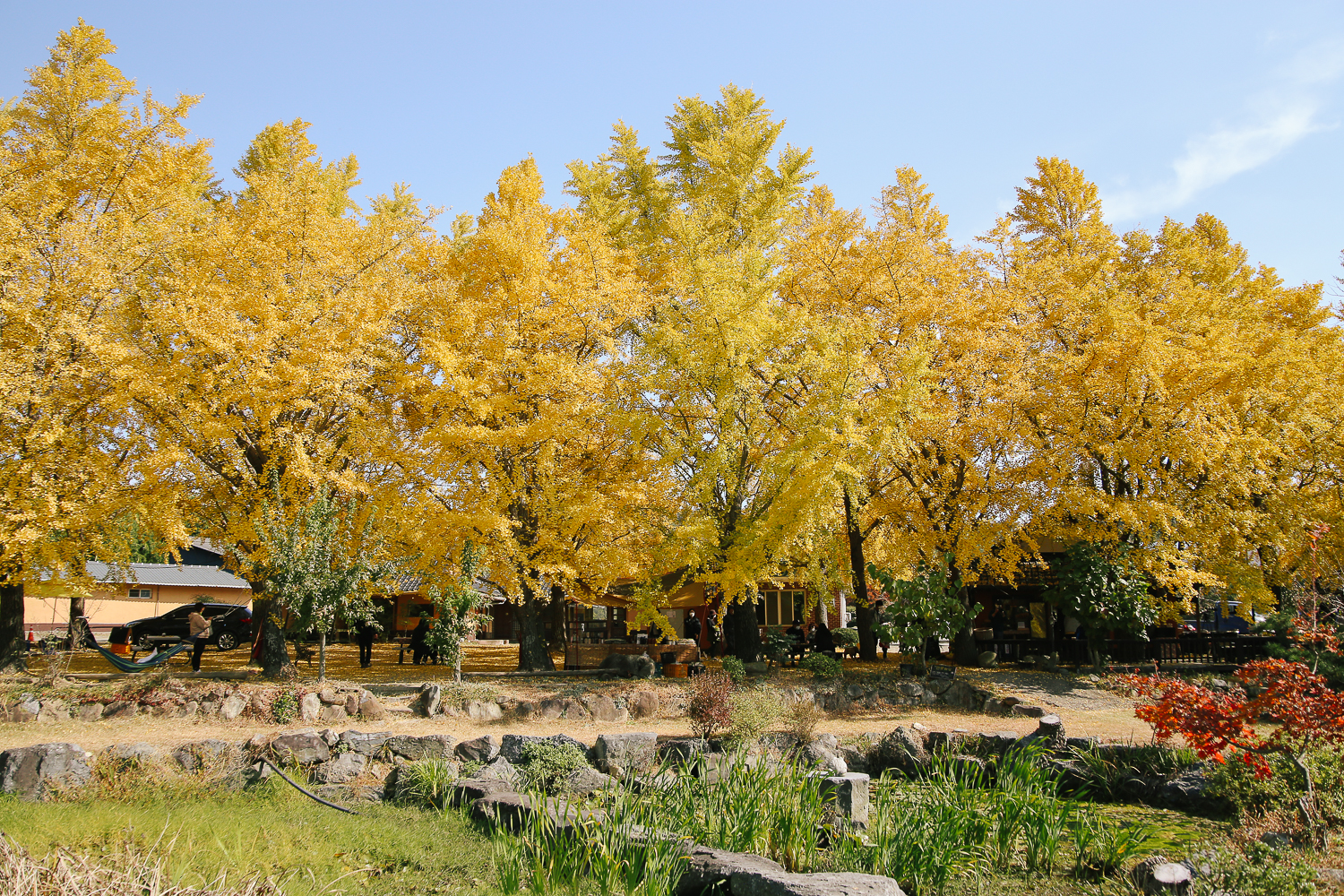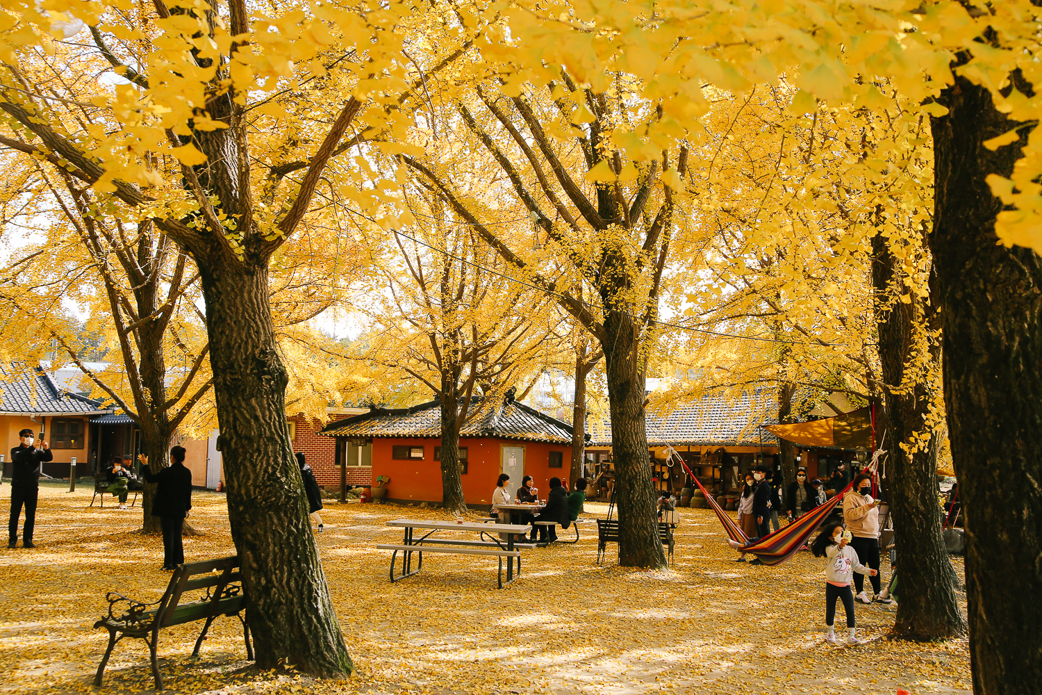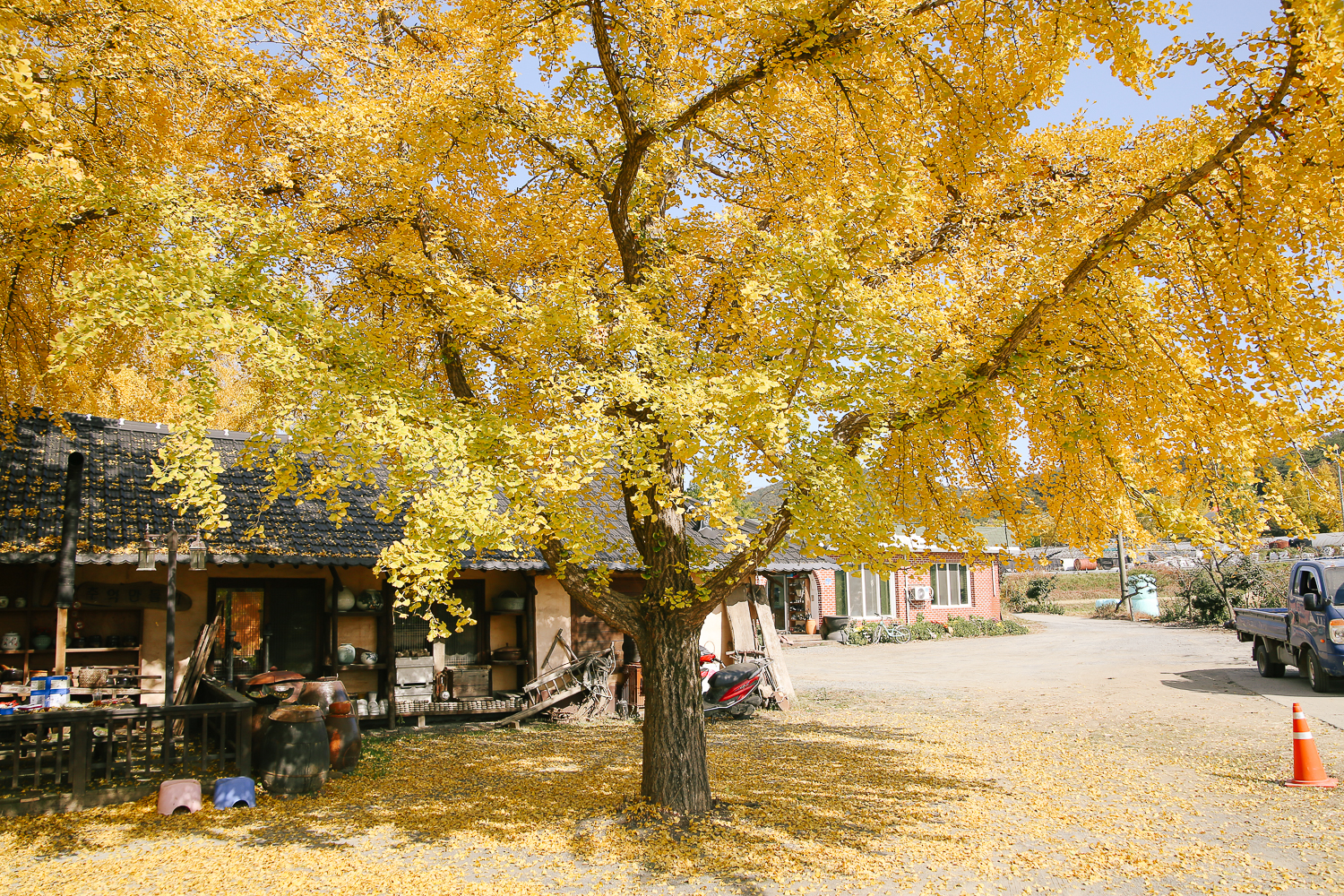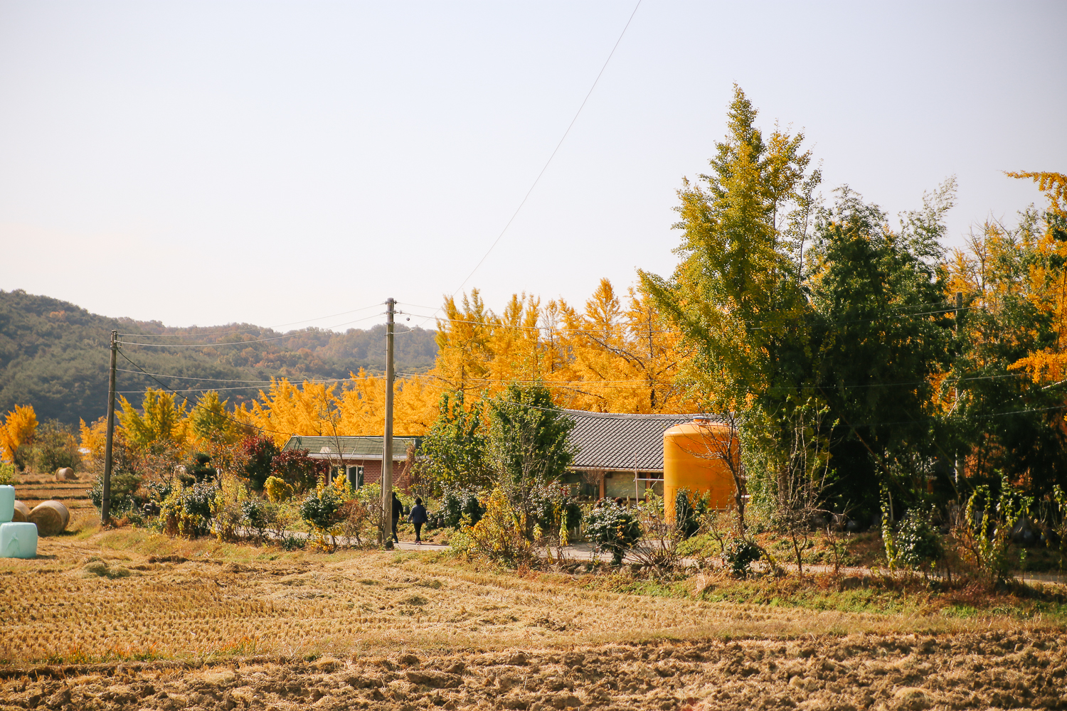 저 멀리 보이는 은행마을의 핫스팟! 멀리서 봐도 황금빛으로 흔들거리는 은행나무들을 볼 수 있다. 좌측에 보이는 기와집은 카페촌이다. 기와집 주위에는 옛날에 쓰던 소품들이 많아서 꽤나 정감이 갔다.