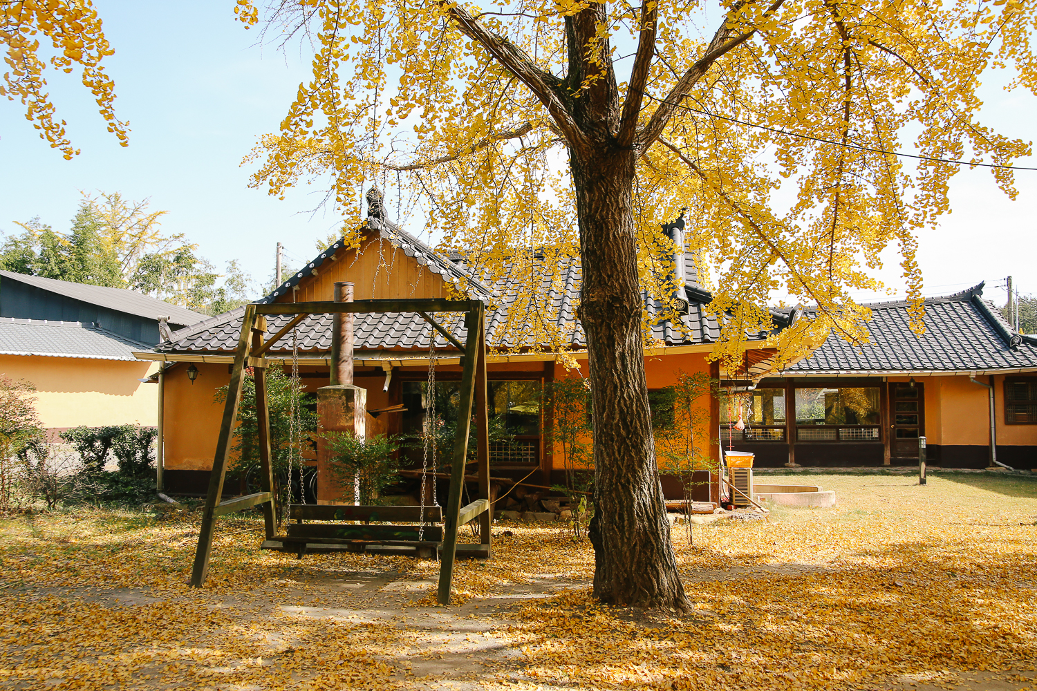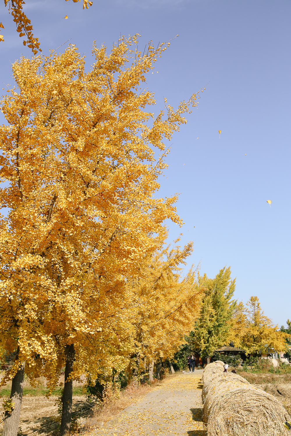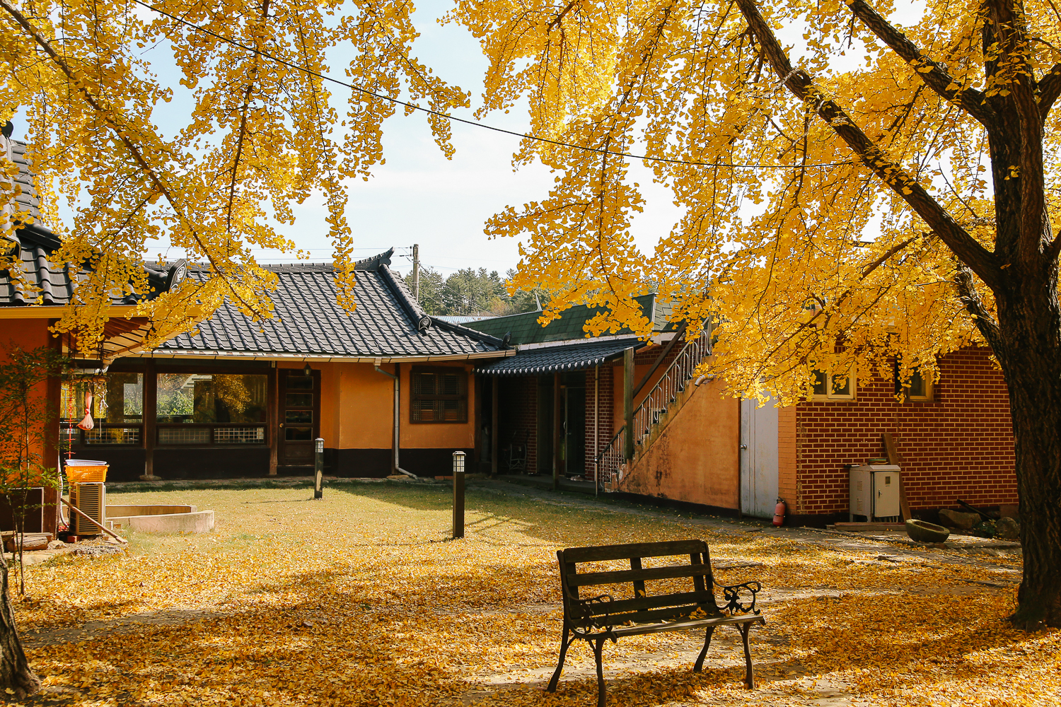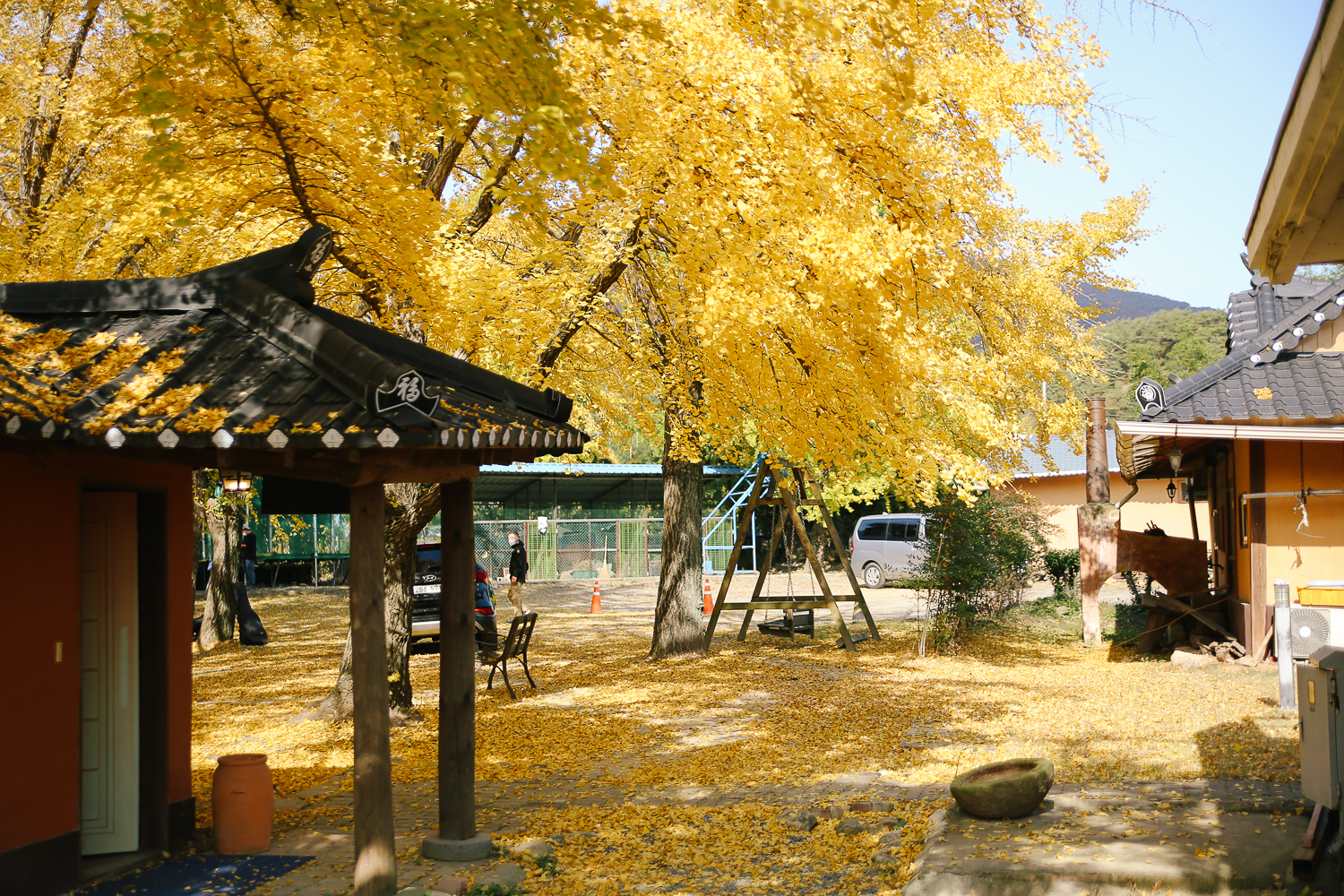 저 멀리 보이는 은행마을의 핫스팟! 멀리서 봐도 황금빛으로 흔들거리는 은행나무들을 볼 수 있다. 좌측에 보이는 기와집은 카페촌이다. 기와집 주위에는 옛날에 쓰던 소품들이 많아서 꽤나 정감이 갔다.