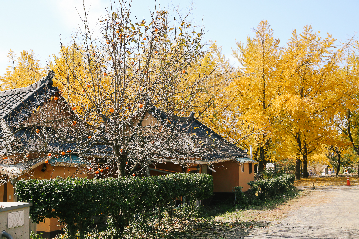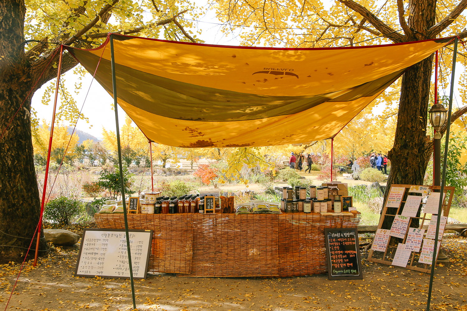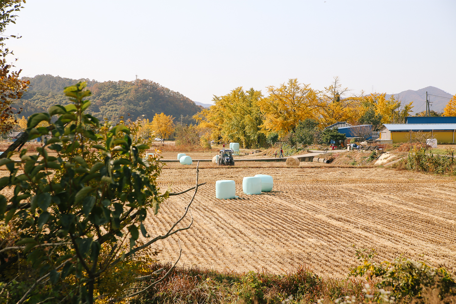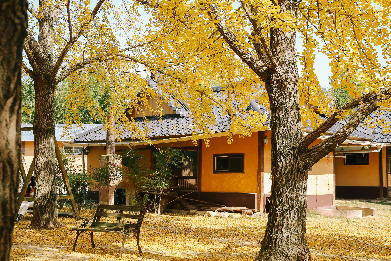 저 멀리 보이는 은행마을의 핫스팟! 멀리서 봐도 황금빛으로 흔들거리는 은행나무들을 볼 수 있다. 좌측에 보이는 기와집은 카페촌이다. 기와집 주위에는 옛날에 쓰던 소품들이 많아서 꽤나 정감이 갔다.