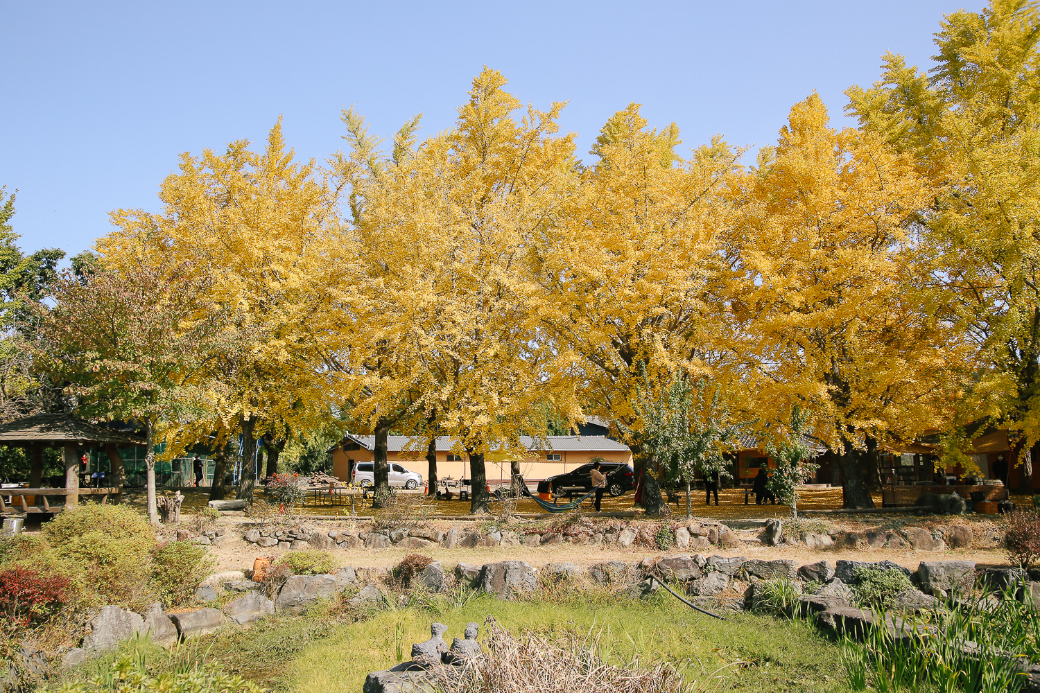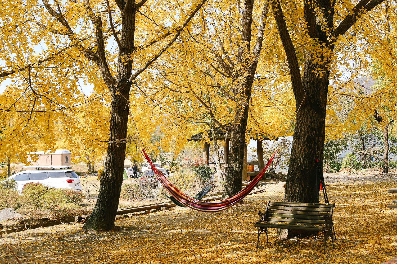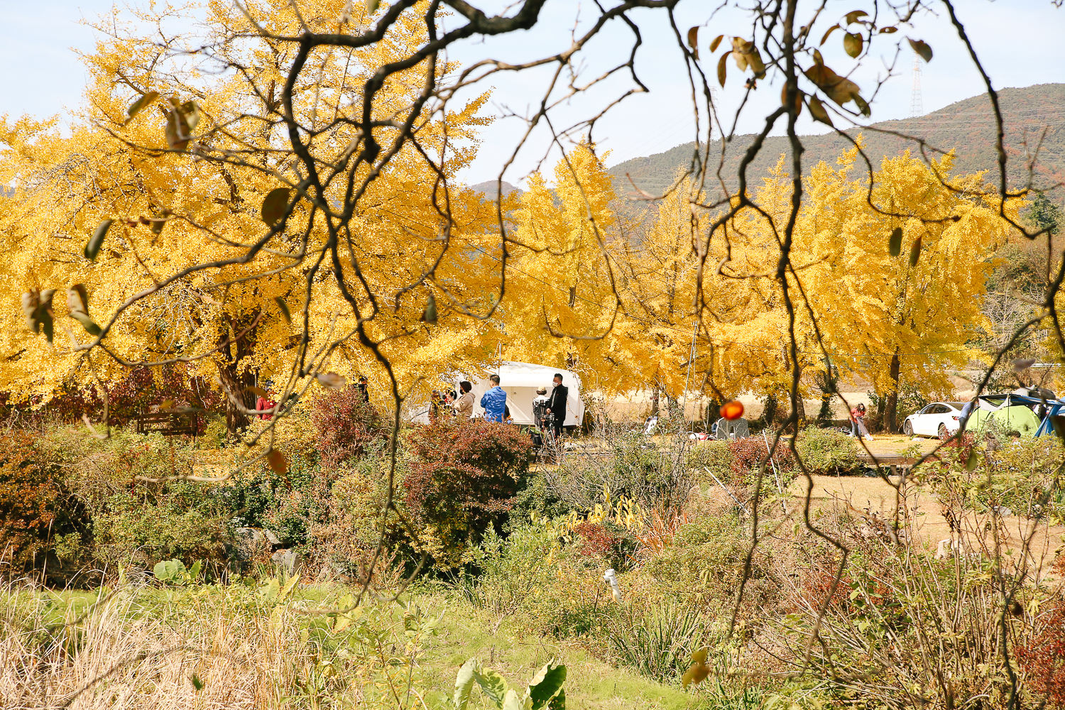 옆에 있던 오토 캠핑장. 이곳에 차박으로 텐트를 치고 쉬고 있는 사람들도 꽤 있었다. 카라반도 한대 보였는데, 아마 원래 자리했던 게 아닐까 싶었다. 묘하게 은행나무와 어우러지는 모습이 정말 예뻤다.