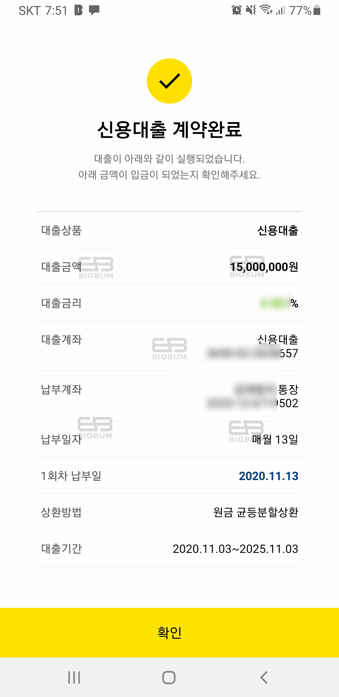 대출을 실행하고 나면 안내 메시지가 들어온다. 이제 잔금일이 얼마 남지 않았다. 바로 다음주이다. 첫 매수인만큼 어리바리하지 않고 잘 해결해야 할 텐데...ㅎㅎ 아무튼 누구나 쉽고 간편하게 서류제출 없이 가능한 카카오 뱅크 신용대출 방법이었다!