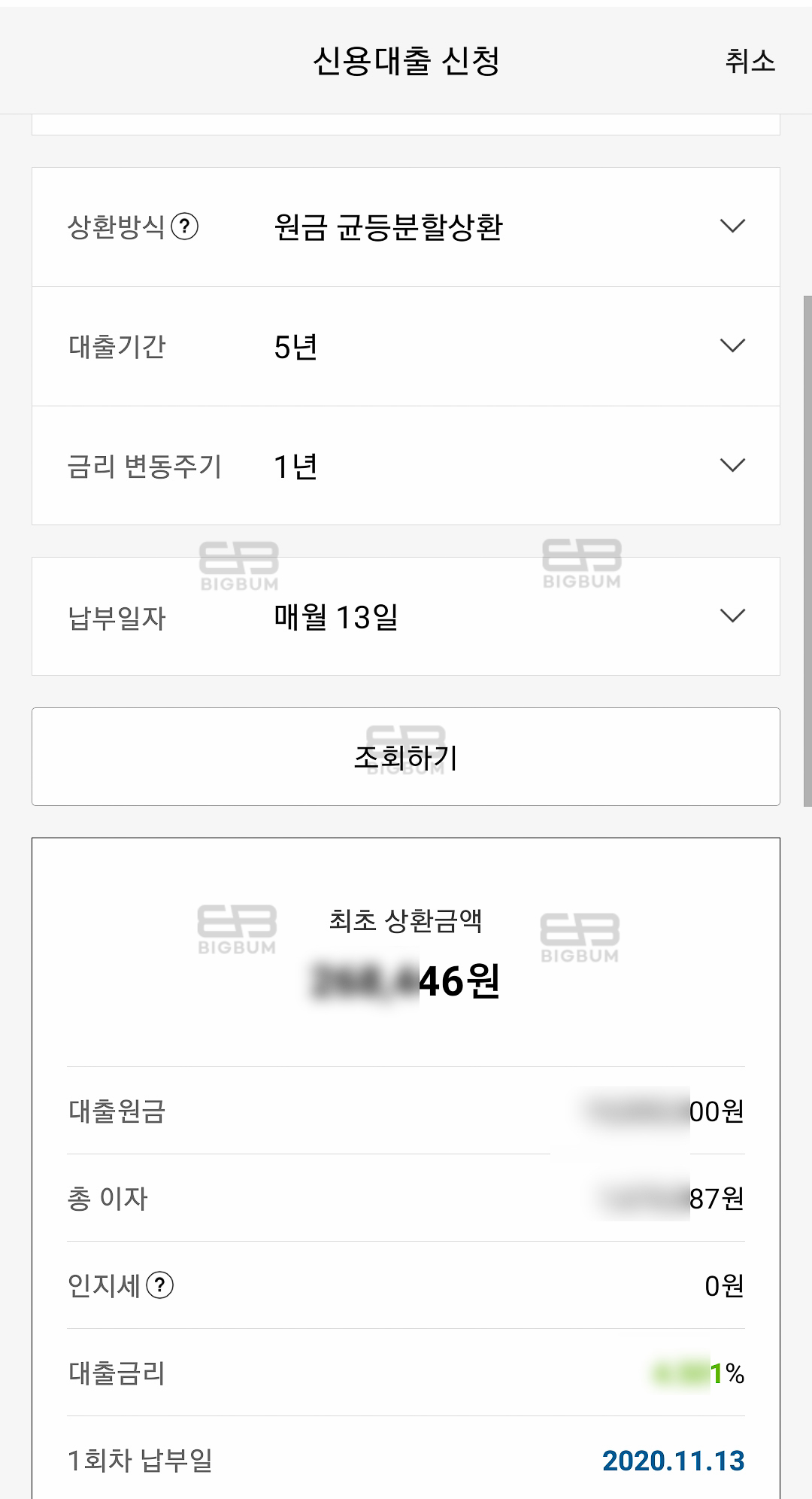 ⑤로딩 완료 후 왼쪽 이미지처럼 나의 한도, 대출금리가 출력된다. 여기서 대출을 진행하고자 한다면 상환방식, 필요한 금액, 대출기간, 금리 변동주기, 납부일자를 적고 대출 계약하기를 누르면 된다. 하지만 대략적인 금액 조회만을 위해서라면 해당 단계에서 종료해도 무방하다.