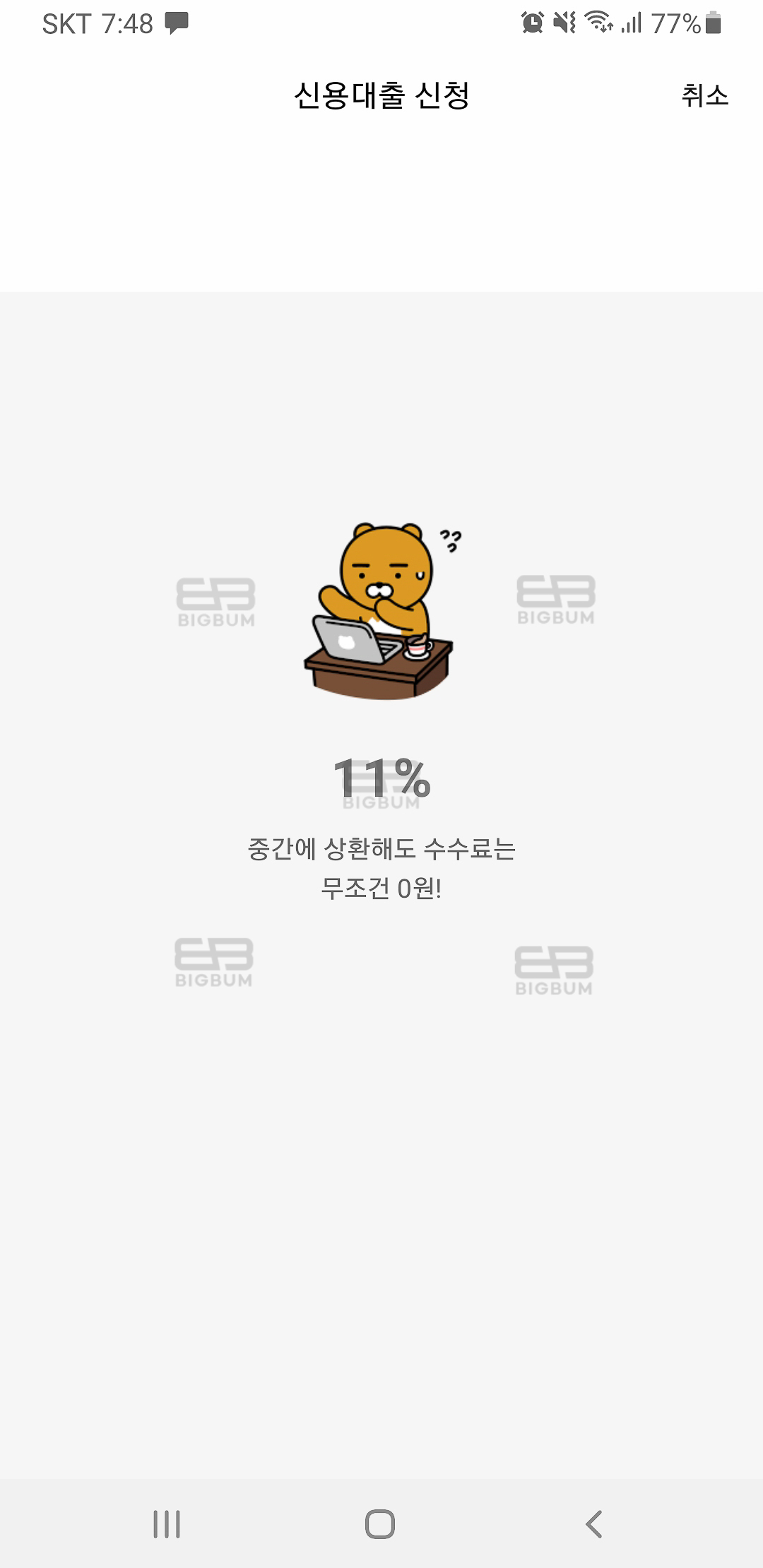 ④ 재직/소득 정보를 입력 후 다음버튼을 누르면 1분 내외로 로딩이 진행된다. 입력한 정보를 토대로 본인이 대출 가능한 한도 및 금리가 산출된다.