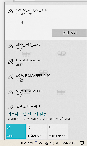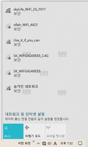 ⑤ 프로그램 설치가 되면 작업표시줄에 지구본 아이콘이 뜬다. 이 부분을 클릭하면 와이파이 내역들이 뜨는 것을 확인할 수 있다. 여기서 본인이 사용하고자 하는 wifi 를 클릭 후 비번을 입력하여 접속하면, 랜선이 연결돼있지 않는 상태에서도 인터넷 사용이 가능하다.