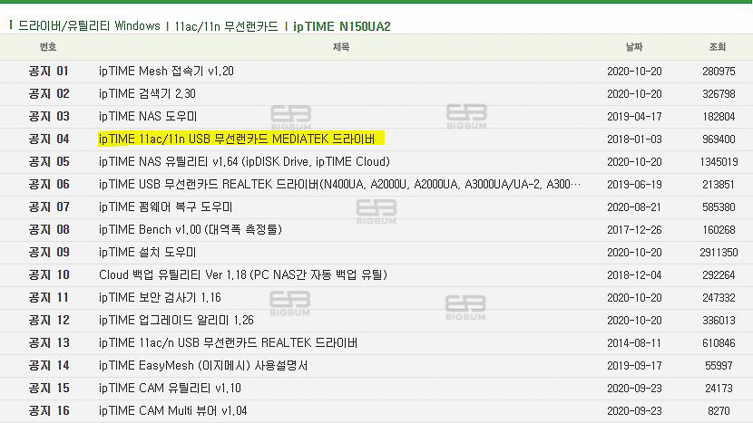 ③ 조회되면 하단에 주요 공지사항이 노출되는데 이중 ipTIME 11ac/11n USB 무선랜카드 MEDIA TEK 드라이버 게시글을 클릭한다.
