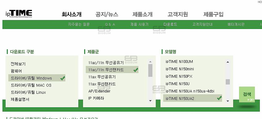 ② 제품의 코드번호에 따른 선택(드라이버/유틸 Windows → 11ac/11n 무선랜카드 → ipTime N150 UA2) 선택 후 검색 버튼 클릭