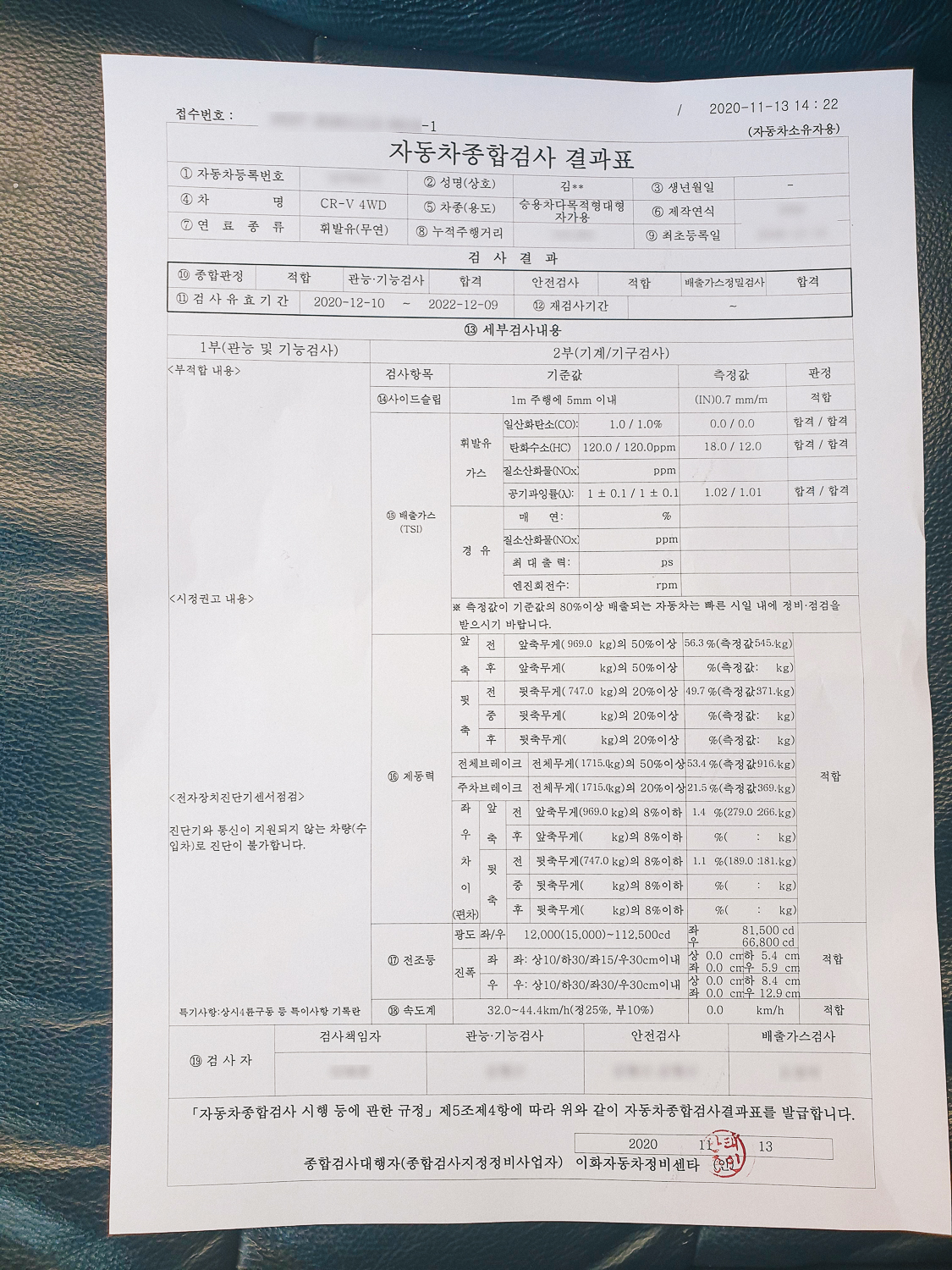 근 3개월 내에 오일류 교체와 전구등도 교체를 한탄이 특별한 이슈사항 없이 모든 내용이 적합으로 나왔다...ㅎㅎ 토요일중에 방문하려고 했지만 평일에 방문하여 미리 자동차 정기검사를 끝마칠 수 있어서 너무 좋았다 :) 토요일은 낮잠이 포인트인데,,, 헤헷