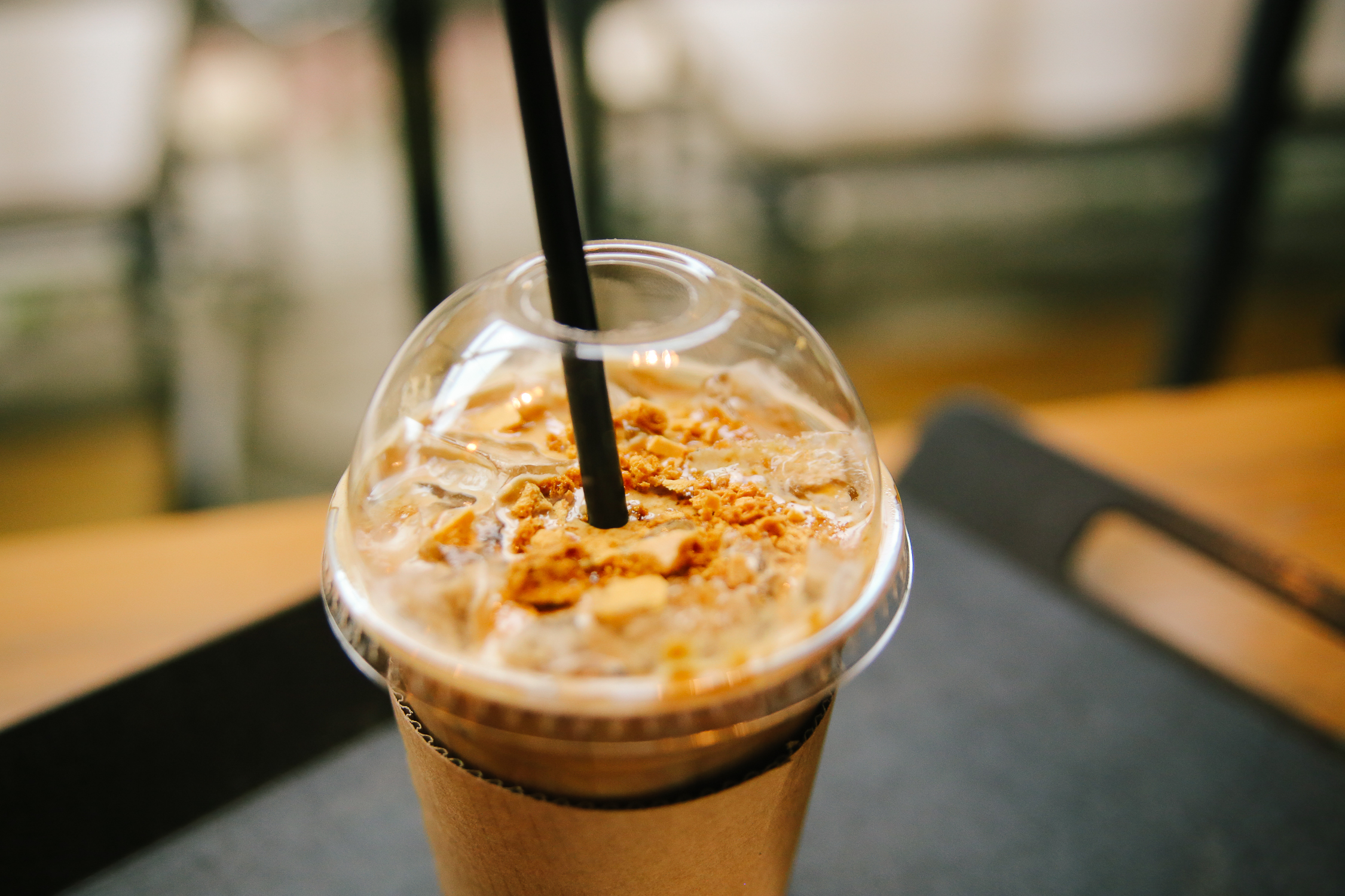 이번에는 신메뉴가 생겨 시켜보았는데 달고나라떼(6,300원), 아인슈페너(6,300원) 아이스를 주문하였다. 새로 생긴 달고나라떼는 굉장히 고소하면서 달달한 라테였다. 우리는 카페 창가에 있는 테이블에 자리했다.