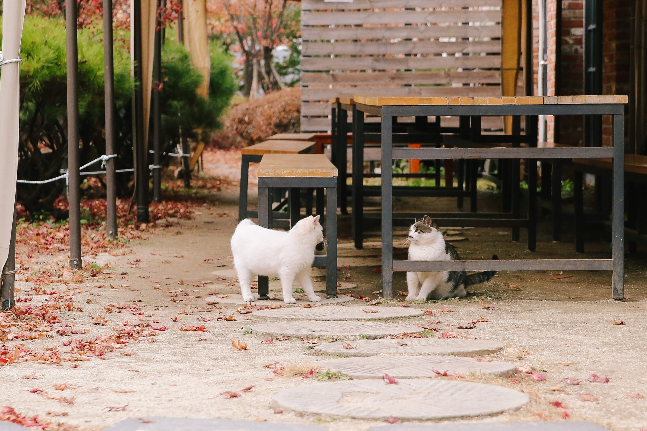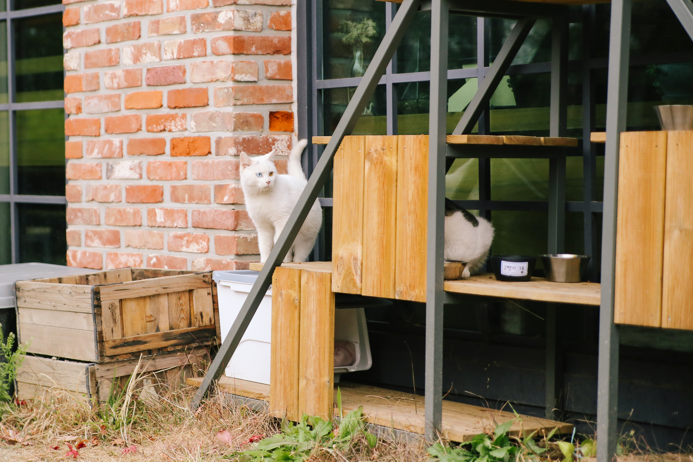 커피 샤워는 어느 순간부터 길고양이들을 위한 캣타워와 공간을 마련해주었고, 오며 가며 지나다니는 고양이를 볼 수 있다. 이날은 딱 두 마리의 고양이를 보았는데, 오드아이의 흰색 고양이와 고등어 고양이가 있었다.