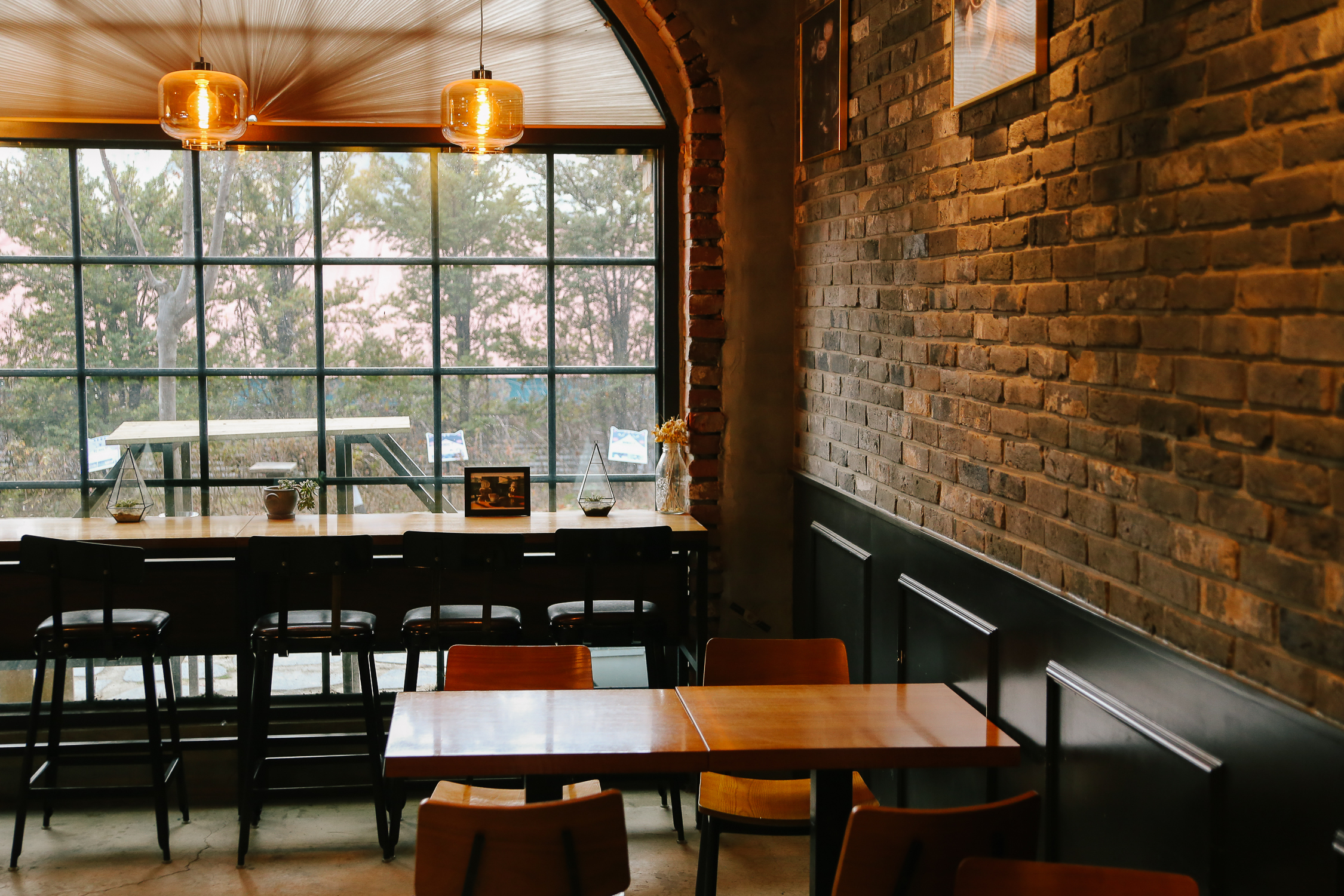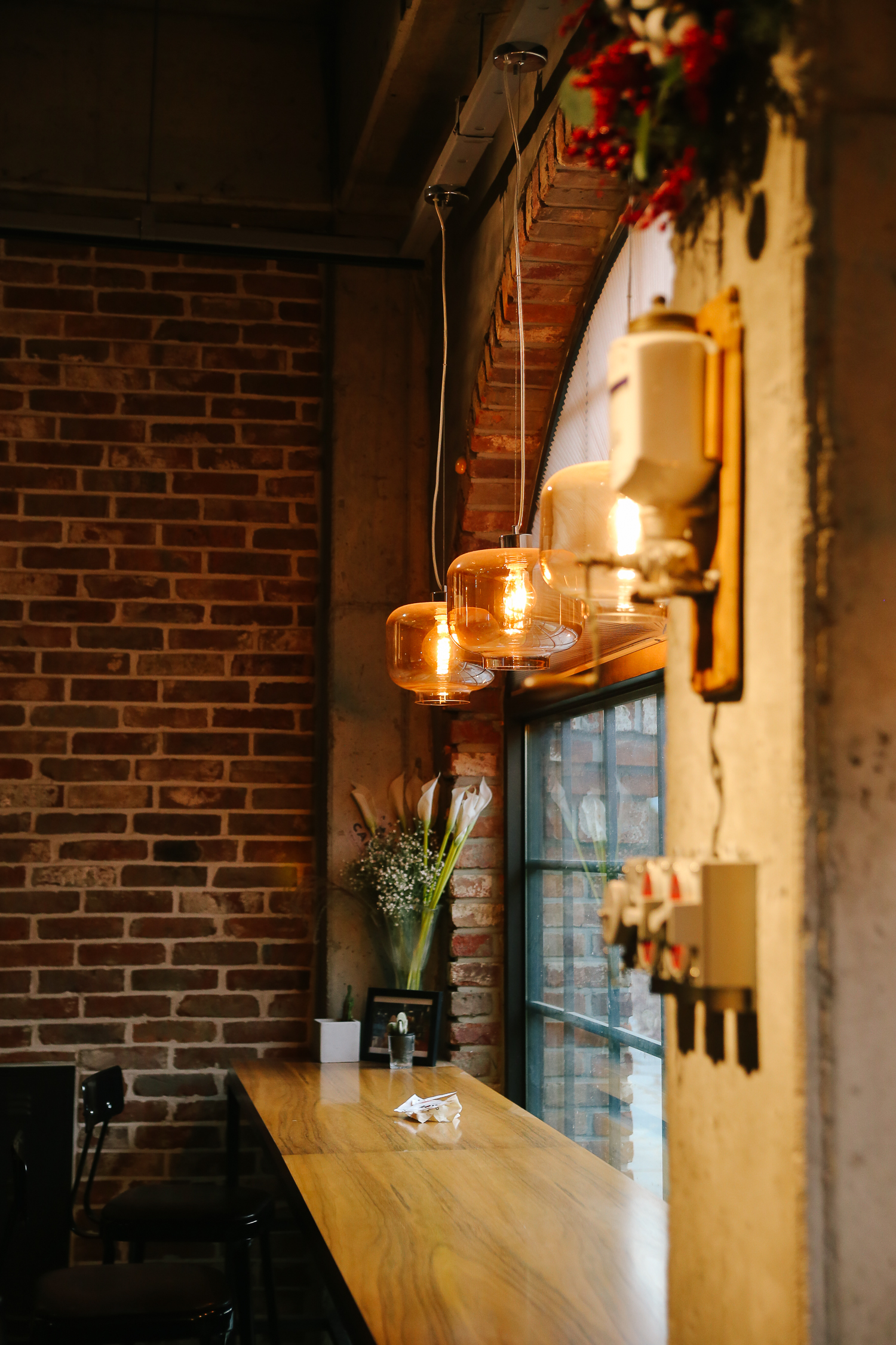 카페에 손님이 없고 한산한 편이라 카운터 쪽 사진도 담을 수 있었다 :) 조명과 벽면의 벽돌이 굉장히 잘 어울리는 따뜻한 공간이다.
