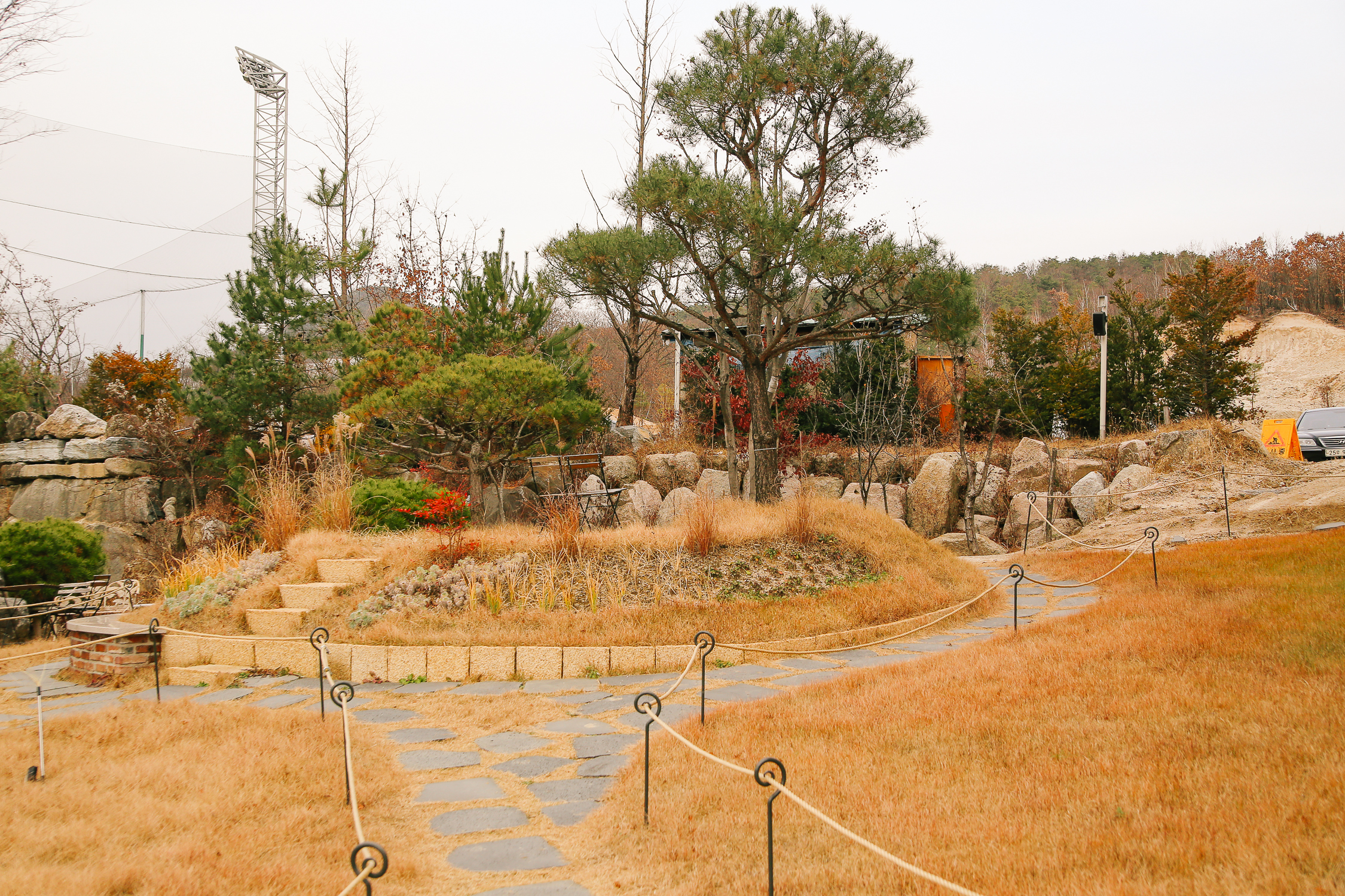 제법 쌀쌀해진 날씨덕에 초록빛 잔디는 갈색빛을 띠고 있었고, 소나무만 초록빛으로 우리를 반겼다. 소나무 쪽이 있는 곳에는 냇가가 있었는데 이곳도 흙으로 채워서 잔디밭으로 바꿔놓았다.
