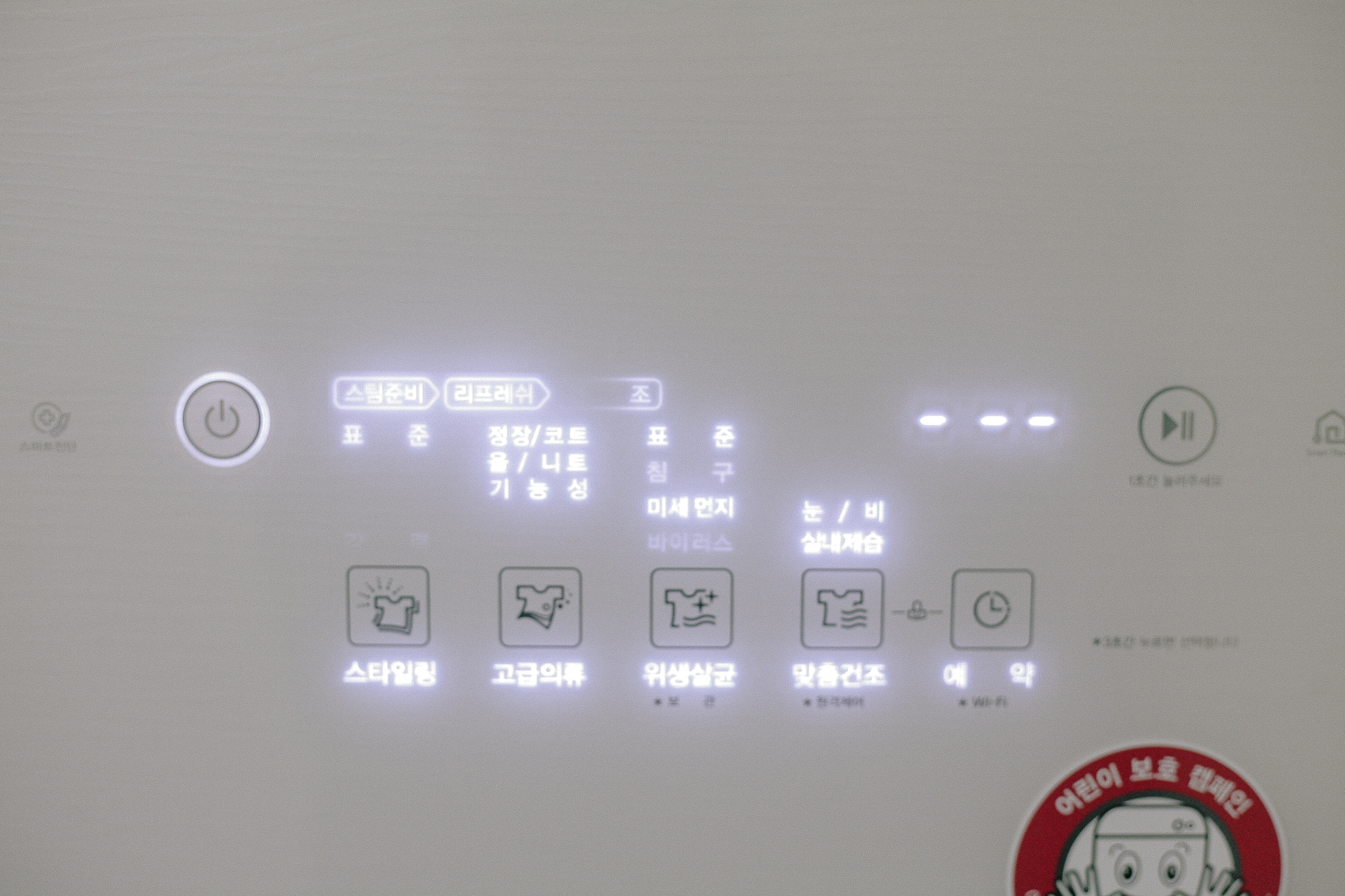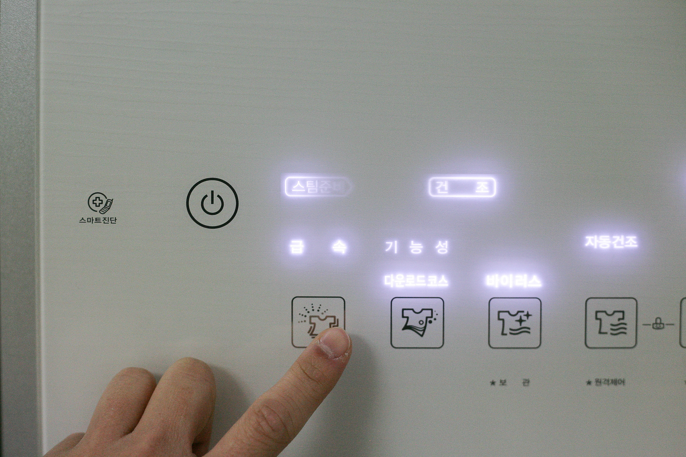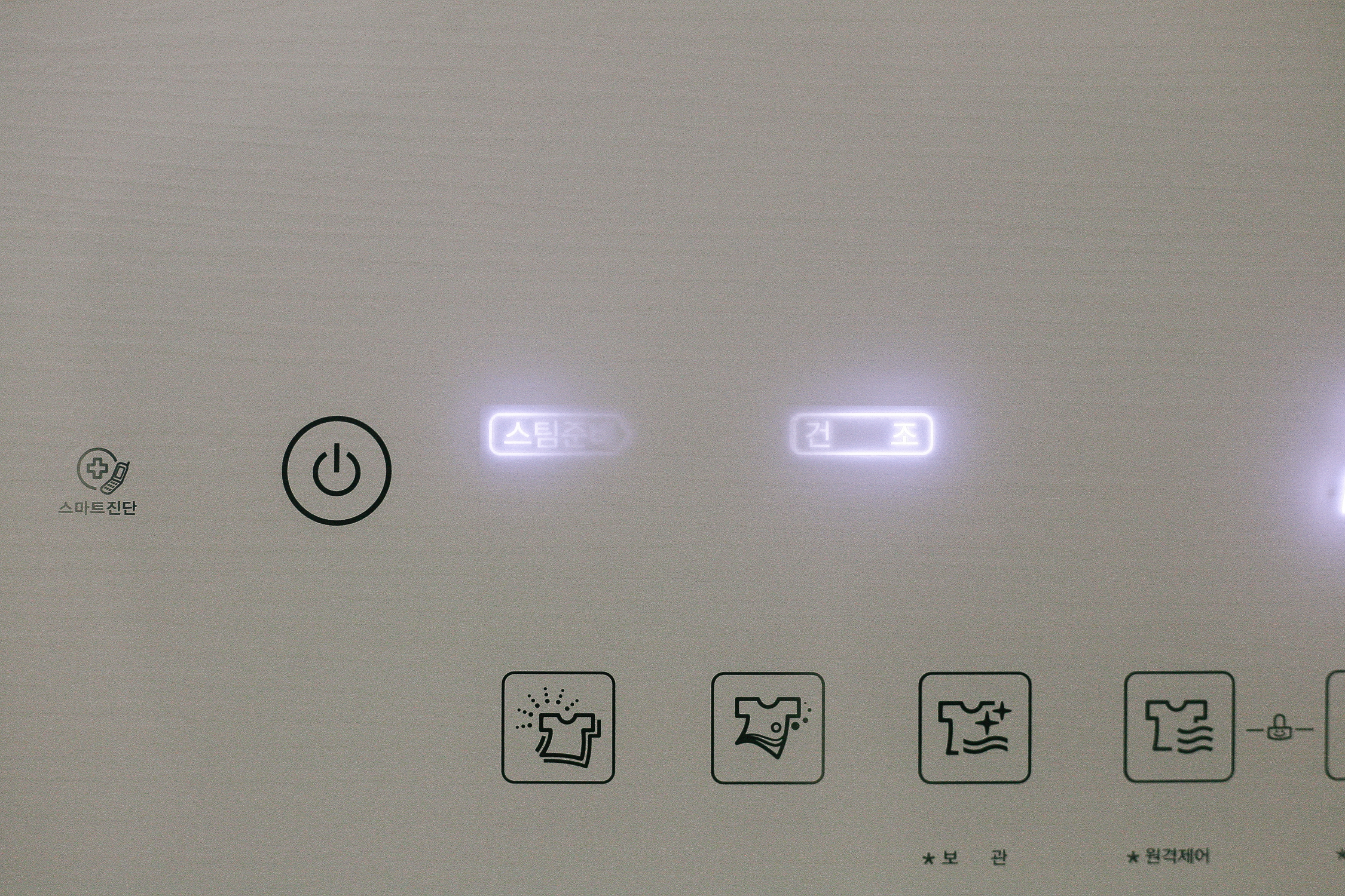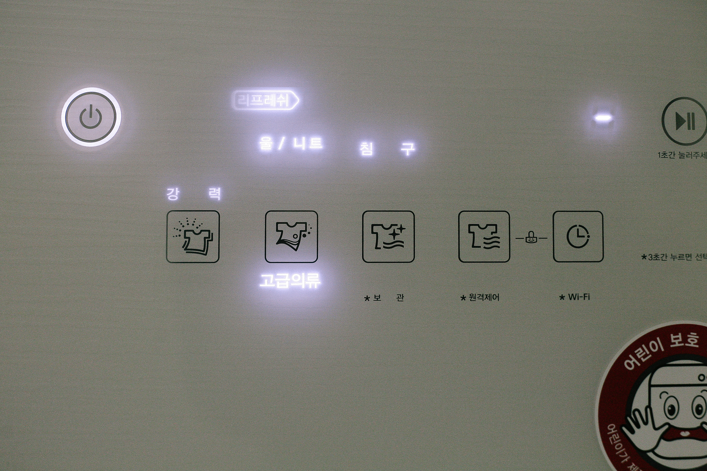 전원 버튼을 꾹 눌러주면 모든 버튼에 불이 들어오면서 활성화가 되는데 넣은 의류에 알맞게 세팅값을 변경해주면 된다. 불이 들어온 부분 아래 아이콘으로 버튼 모양이 그려져 있는데 이것을 꾹꾹 한 번씩 눌러주면 선택사항이 변경되는 방식이다.