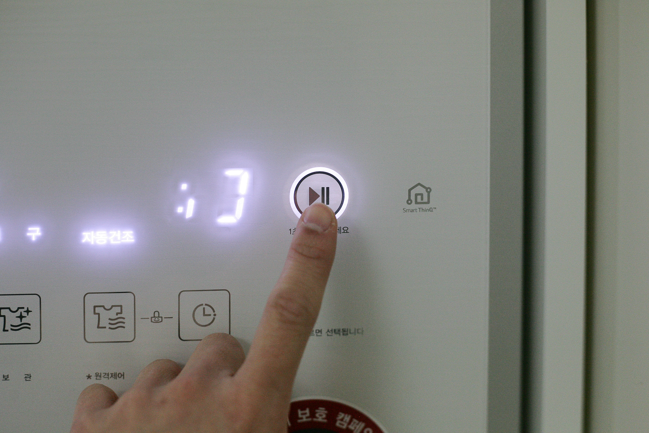 나는 일단 고급의류 자동 건조 등 거의 기본값으로 설정하여 진행을 해보았다. 모든 설정값이 완료되면 우측 끝에 있는 정지 및 시작 버튼을 1초간 길게 눌러주면 진행이 된다. 버튼 왼쪽에 시간이 출력되면서 스타일러 작동이 되는 것!