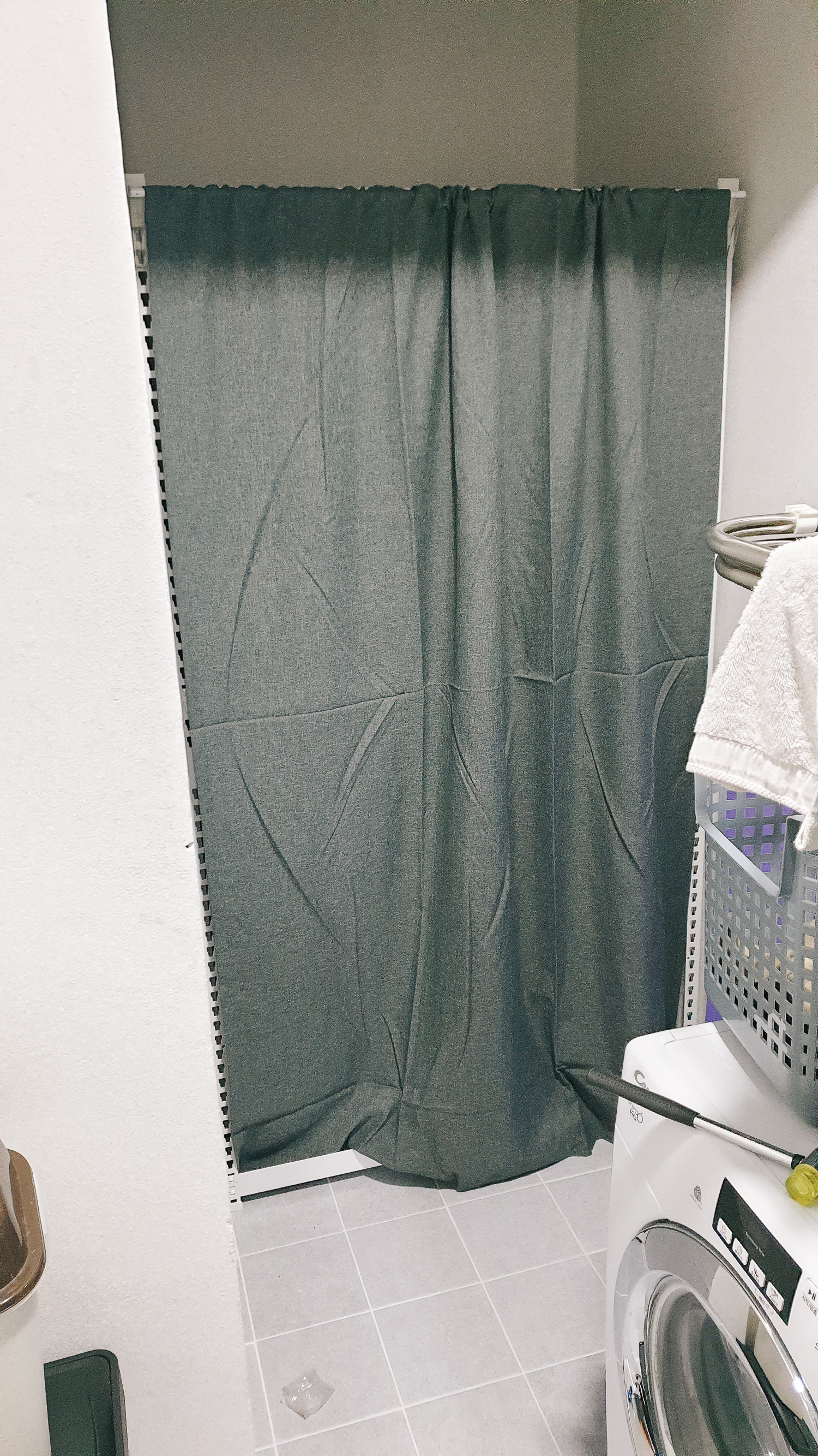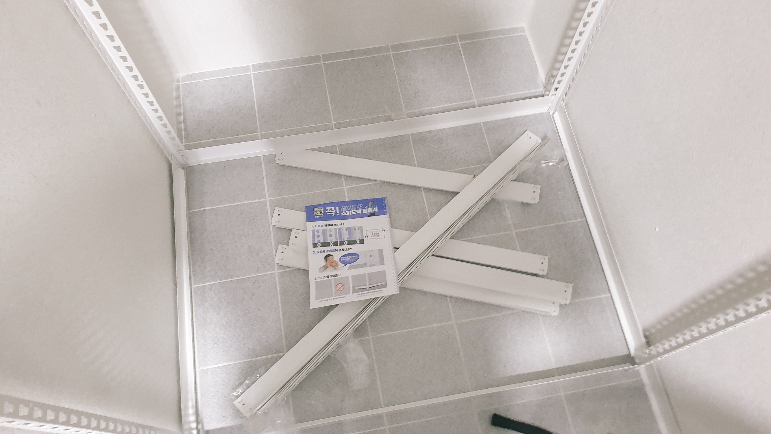 그리고 많은 물품을 수납했을 때 지저분해 보일 수 있어 커튼까지 함께 주문하였다. 800~1200mm 압축봉 형태의 커텐봉가 있어 주문한 제품에 맞게 조정이 가능하다. 커텐봉을 거치할 수 있도록 하는 고정바가 있는데 앵글 프레임 홈에 넣어서 고정하면 된다. 커텐봉 양쪽 지름이 상이하여, 그게 맞게 커텐 고정바도 걸어두는 것이 좋다.