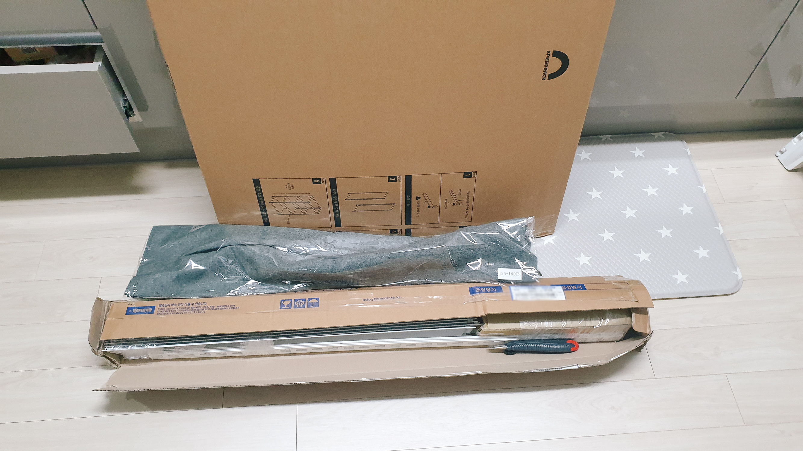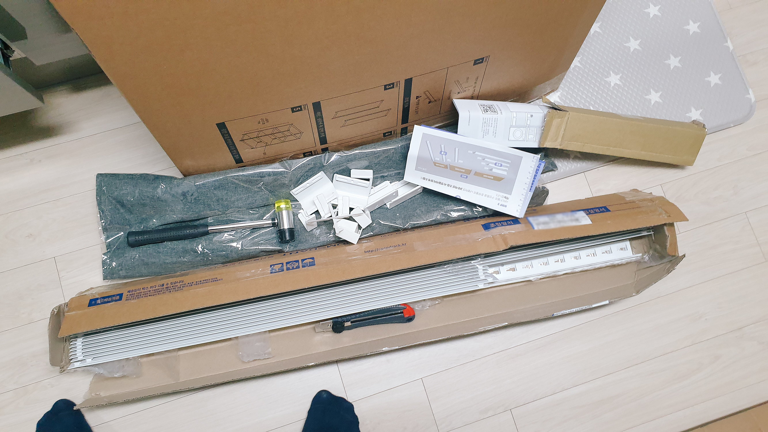 제품 박스는 프레임 철제 프레임 1박스, 상판 1박스, 블라인드, 고무망치 1박스(추가옵션)으로 총 3박스가 왔다. 5시 퇴근이라 6시 전에 집에 도착하여 잽싸게 해가 더 어두워지기 전에 조립을 시작했다.