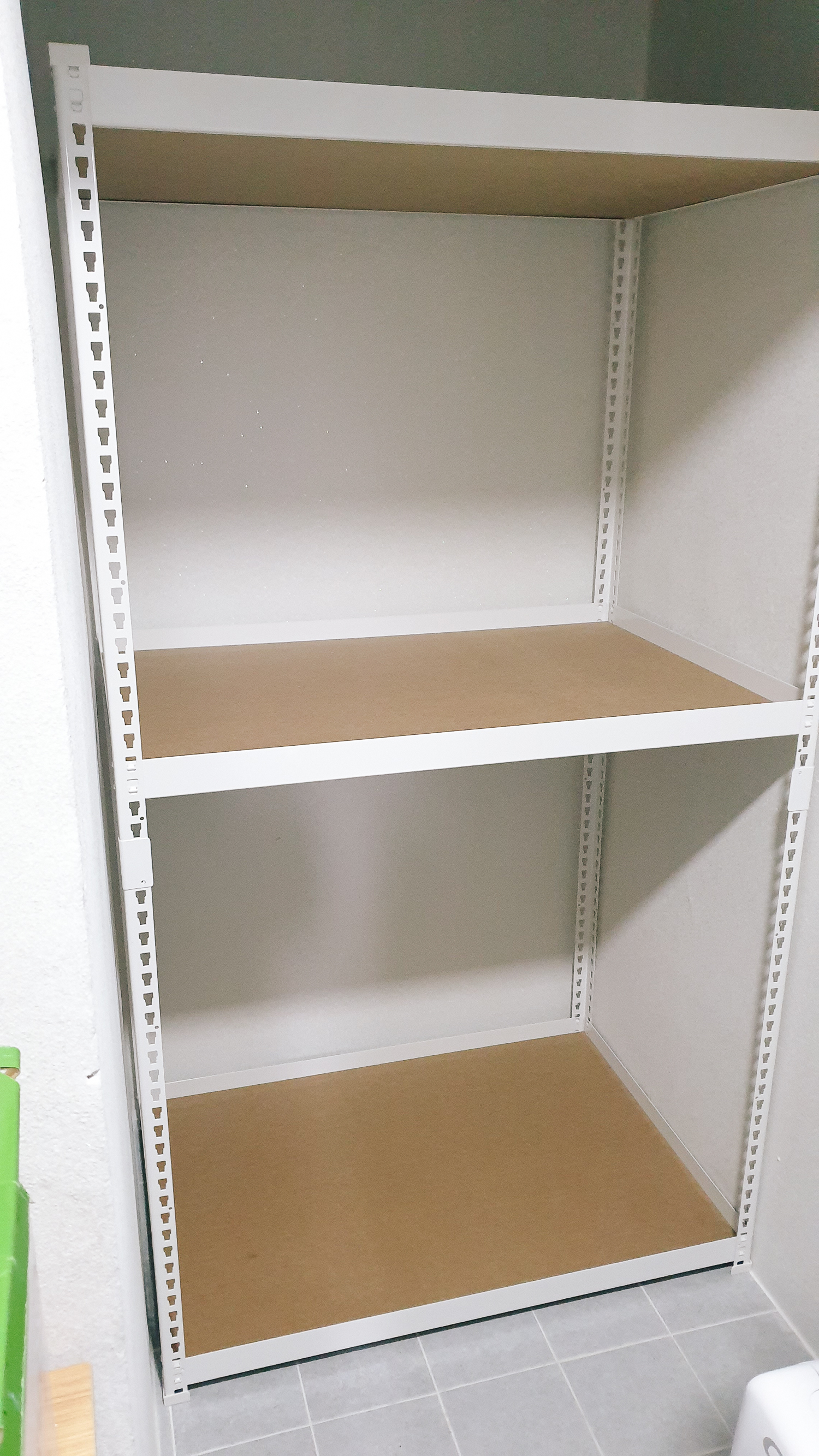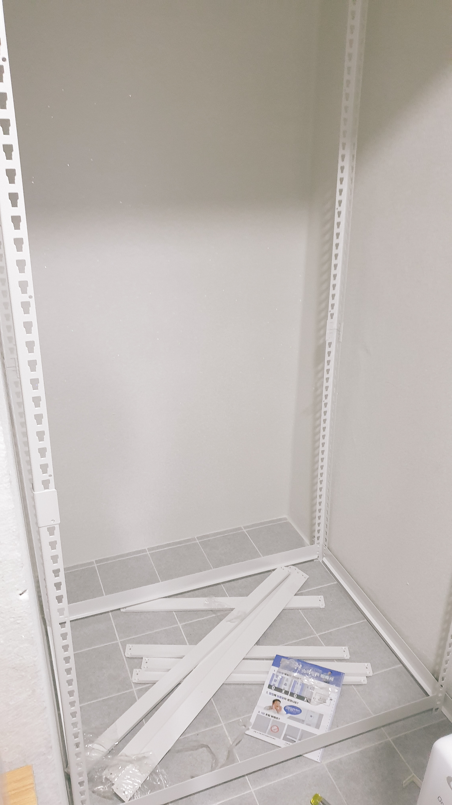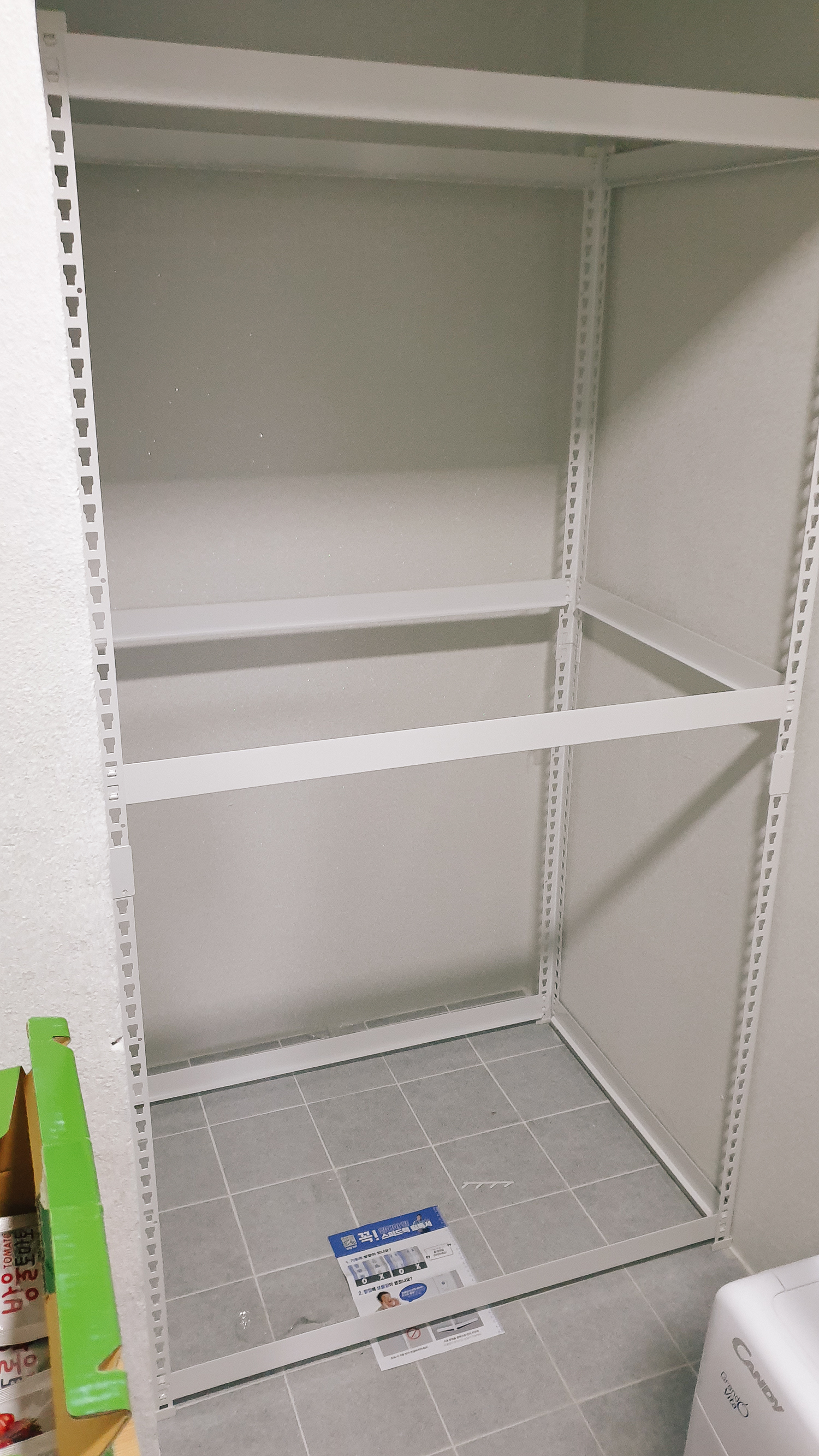 주방 쪽 베란다 안쪽에 넓은 공간이 있다. 이사 전 이곳에 옛날 회색 철제 앵글로 투박하게 수납장으로 되어 있는 공간으로 비슷한 철제이지만 화이트 색상의 깔끔한 디자인 제품이 있어 구매하게 되었다. 베란다 공간을 실측하였고, 바닥면 수평이 어느 곳이든 100% 완벽한 곳이 없기 때문에 좌우 여백 4cm 정도를 두고 주문하였다. 주문 제작 상품이 아닌 기성품 사이즈가 다양하게 있던 터라 가장 적합한 크기는 W1000 x D700 x H1800mm 였다.
