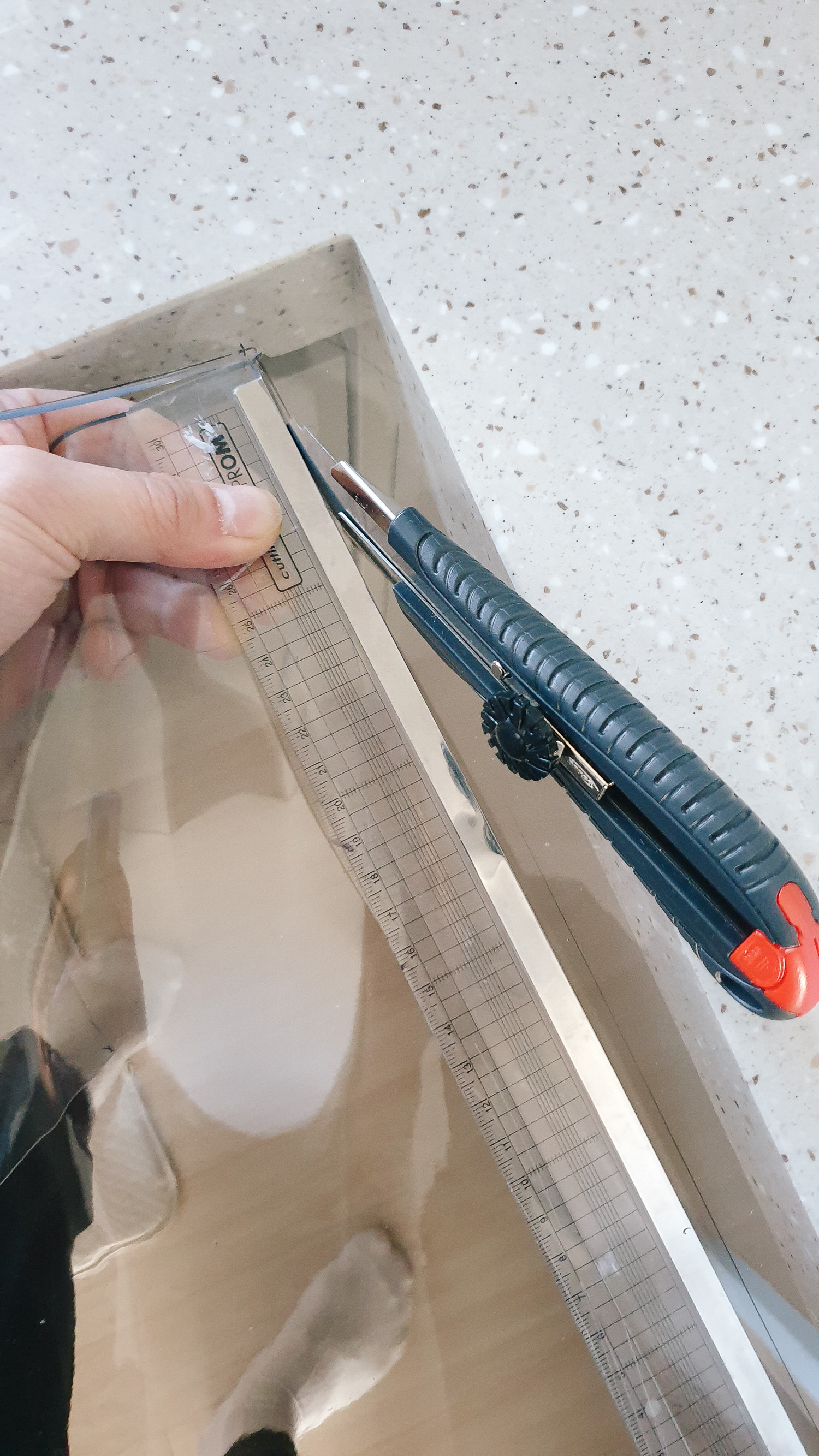 인테리어를 하고 이사를 하다 보니 모든 게 새것이라 사용하는 게 굉장히 조심스럽다. 특히나 아내가 자주 사용하는 주방 공간. ㅎㅎ 렌지대, 수납장에 데코 시트지가 오염될 것을 걱정하여 고민하던 차! 투명 매트가 있다는 것을 알게 되어 주문하게 되었다. 가로폭 40, 50, 60, 70, 80cm 별로 다양한 사이즈가 있으며 수량에 따른 5cm 기장 연장이 되어 주문을 하면 롤처럼 말려서 배송된다. 배송도 하자 없이 깔끔하게 잘 와서 오자마자 치수를 채서 커팅 작업을 한다.