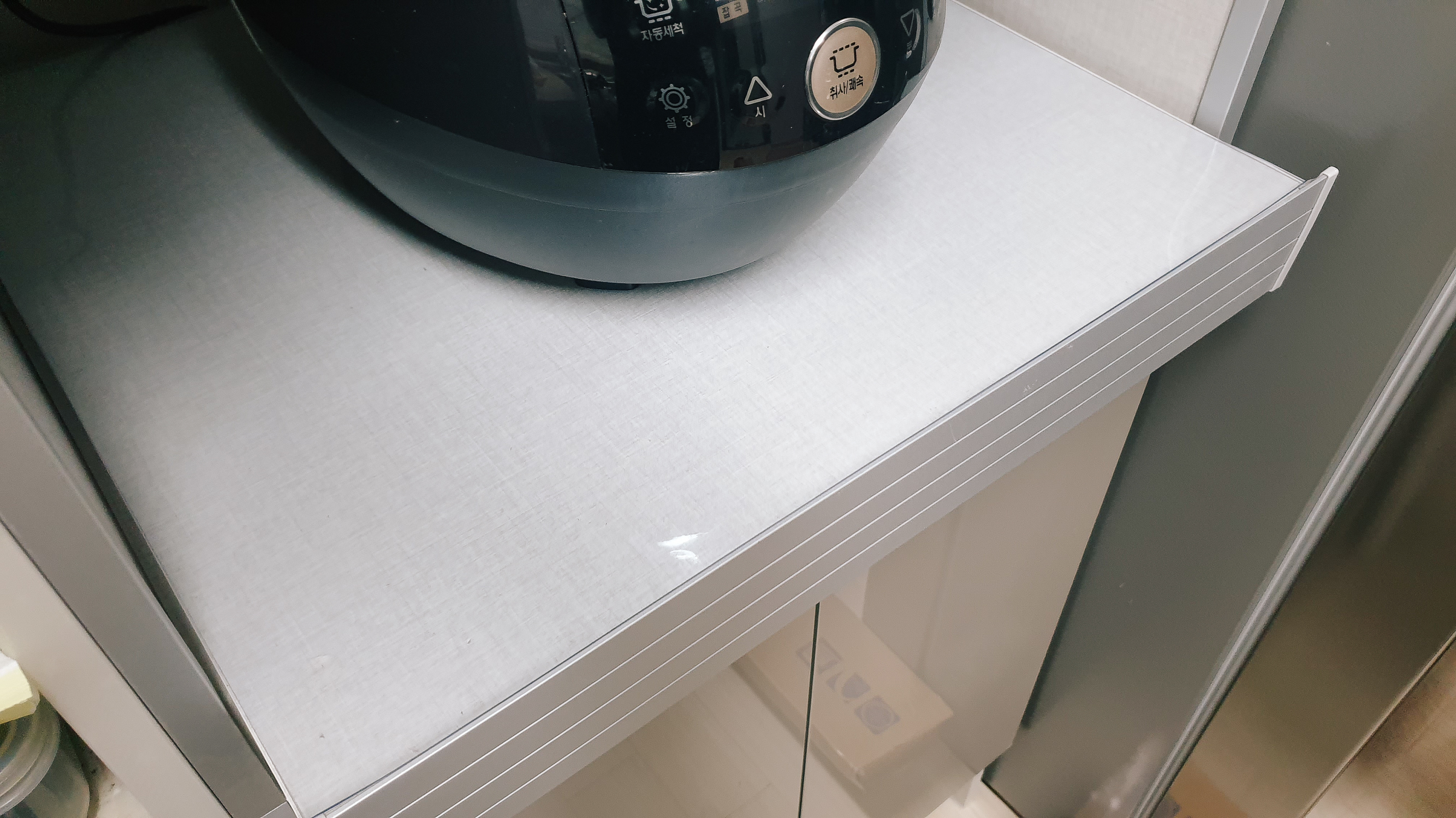 전기밥솥이 있는 부분은 특히나 밥이 되었을 때 수분이 튀거나 묻어나올 수 있어 제일 먼저 깔아주었다. 그리고 그 바로 위층 전자레인지가 있는 수납칸 바닥면에도 투명 매트를 깔아주었다. 투명매트 자체적으로 밀착력이 있어 자리를 잡으면 거의 고정적으로 있다고 생각하면 된다.