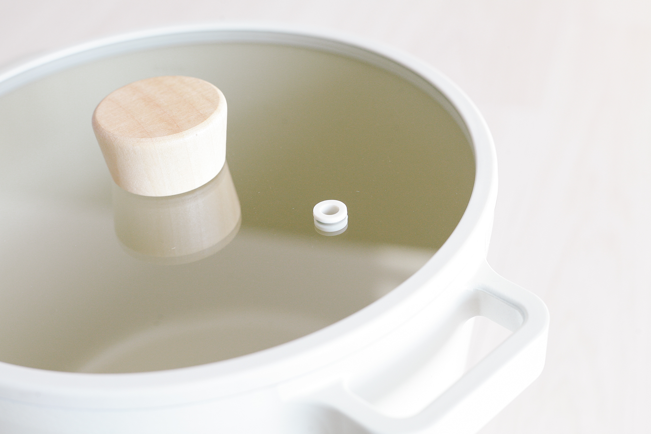 유리 뚜껑에 실리콘이 둘러져 있어 냄비와 뚜껑의 부딪힘을 방지하여 부드러운 사용감을 자랑한다.