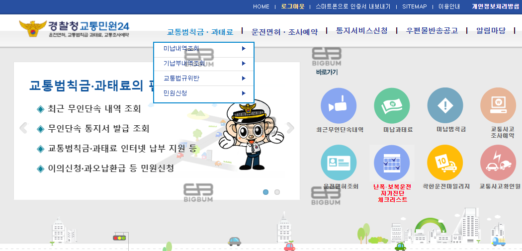 ③ 상단 메뉴에 교통범칙금·과태료를 마우스 오버하면 미납내역조회, 기납내역조회, 교통법규위반, 민원신청의 메뉴가 뜬다.