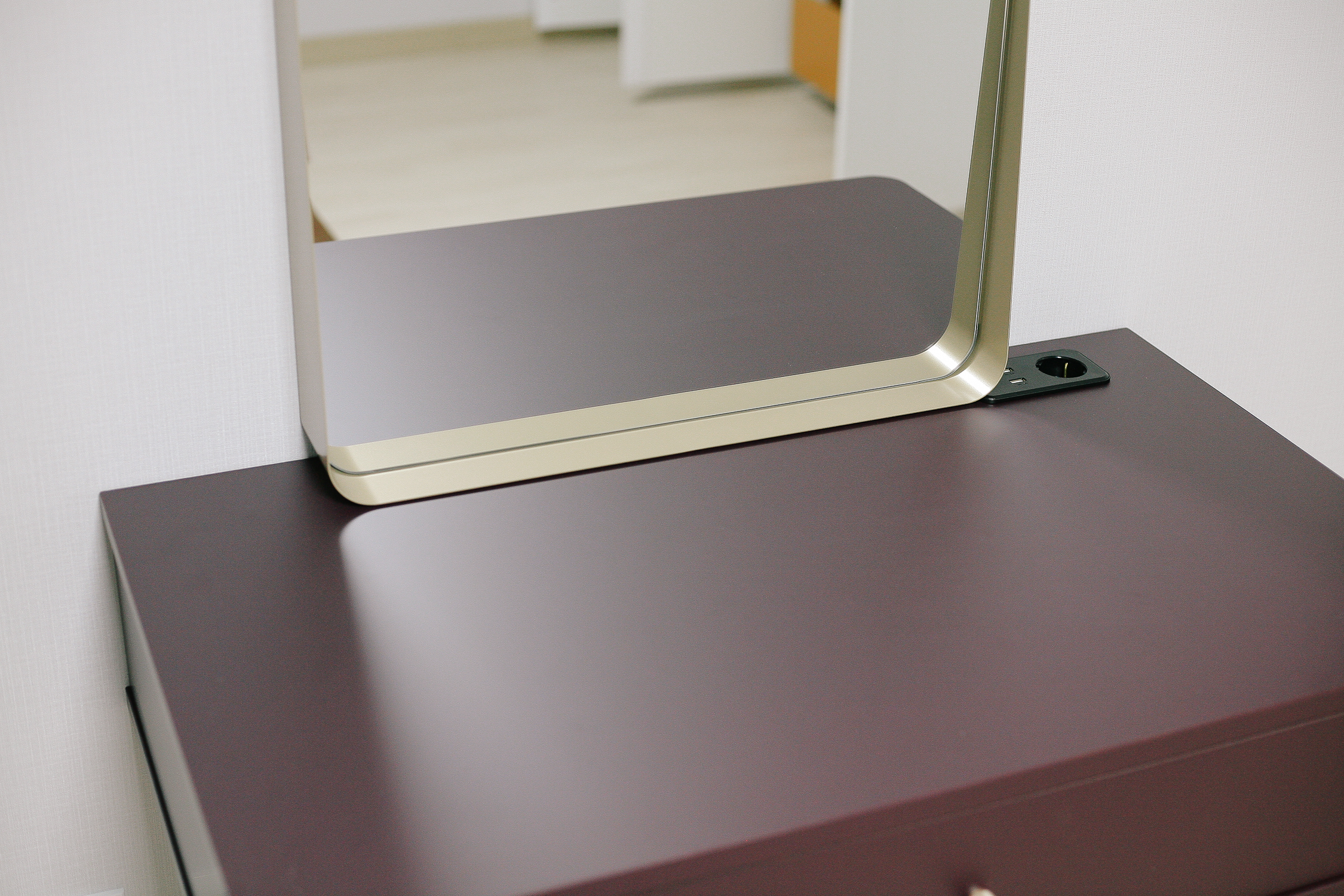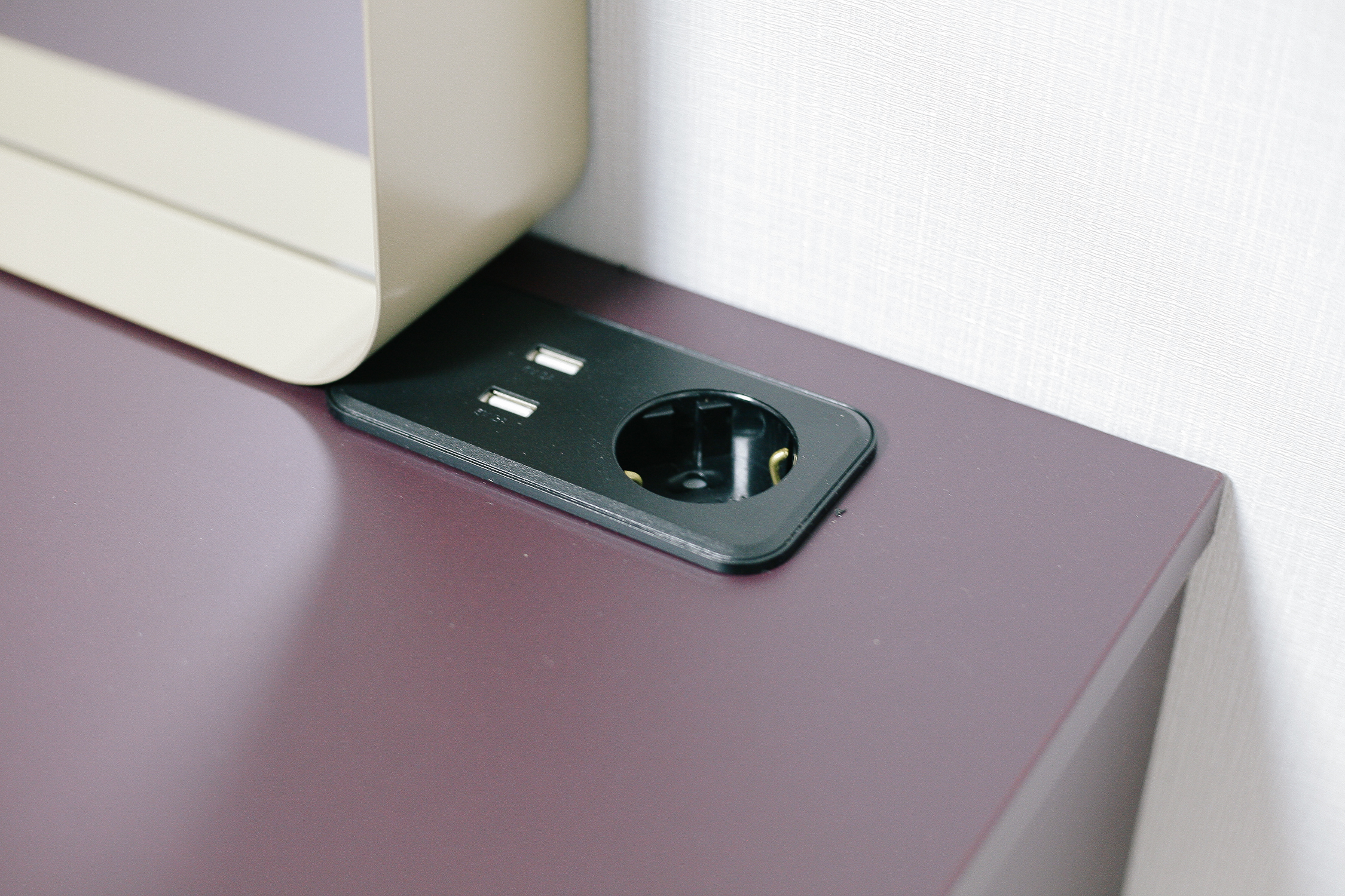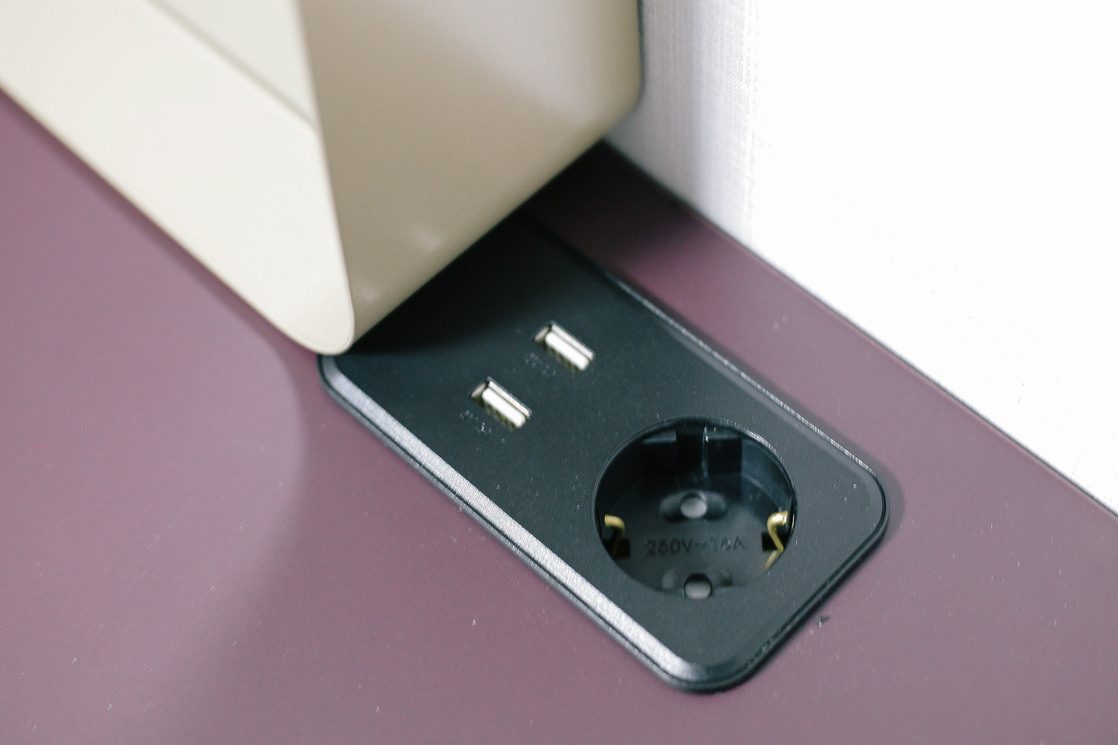 상판에 내장된 콘센트 1구 USB 2 포트를 사용해서 헤어 드라이기, 휴대폰 충전, 고데기 등 뷰티 제품을 편리하게 사용할 수 있다. 또한 노트북을 사용한 작업까지 가능하여 안락한 사무공간으로도 사용될 수 있다.
