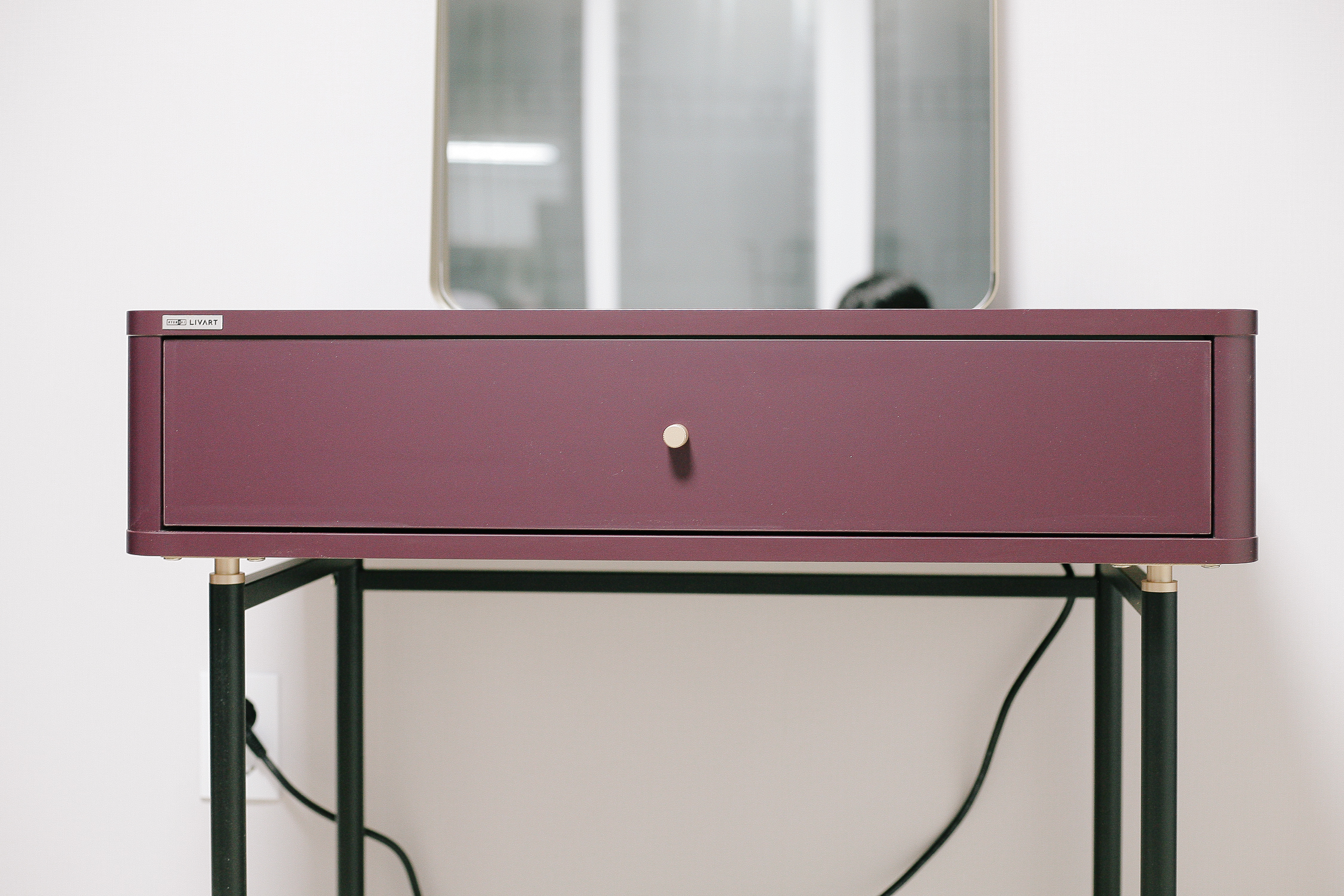 엘로이 오브제형 거울과 800 수납형 화장대를 매칭 한 모습. 보라색과도 잘 매칭이 되는 골드 색상. 화장대 손잡이, 다릿발 등 일부 포인트가 골드로 되어 있어 골드 색상의 오브 제형은 더욱더 예쁜 일체감을 선사한다.