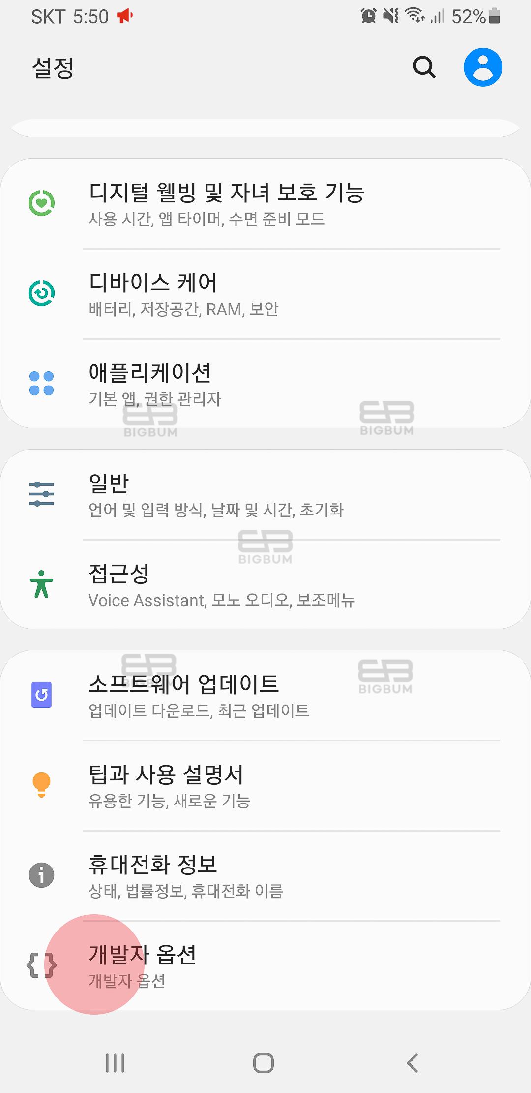 ④ 보안 인증 후 현위치(소프트웨어 정보)에서 전전단계 설정 메뉴로 이동한다. 맨 하단에 보면 '개발자 옵션' 의 메뉴가 생성되어 있는데 이를 터치하여 이동한다.
