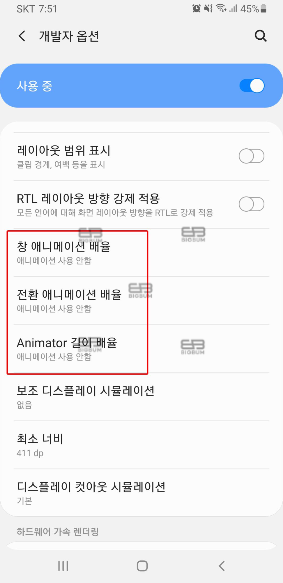이후 휴대폰을 사용해보면(앱 키고, 끄고, 메뉴 움직임 등) 스르륵, 휙휙 하는 듯한 애니메이션 효과가 제거되어 직관적인 인터페이스 움직임을 체감할 수 있다. 전환 애니메이션 효과가 사라지다 보니 허전하고 적응이 안될 수 있다. 하지만 나는 이 설정이 너무 빠르고 마음에 들어 지속적으로 유지하고 있는 상태이다. 만약 너무 빨라서 적응이 안되고 이전상태로 원상복귀하고 싶다면 설정에 개발자 옵션에 접속하여 상단의 사용중 탭을 터치하여 사용안함으로 바꿔주면 된다.