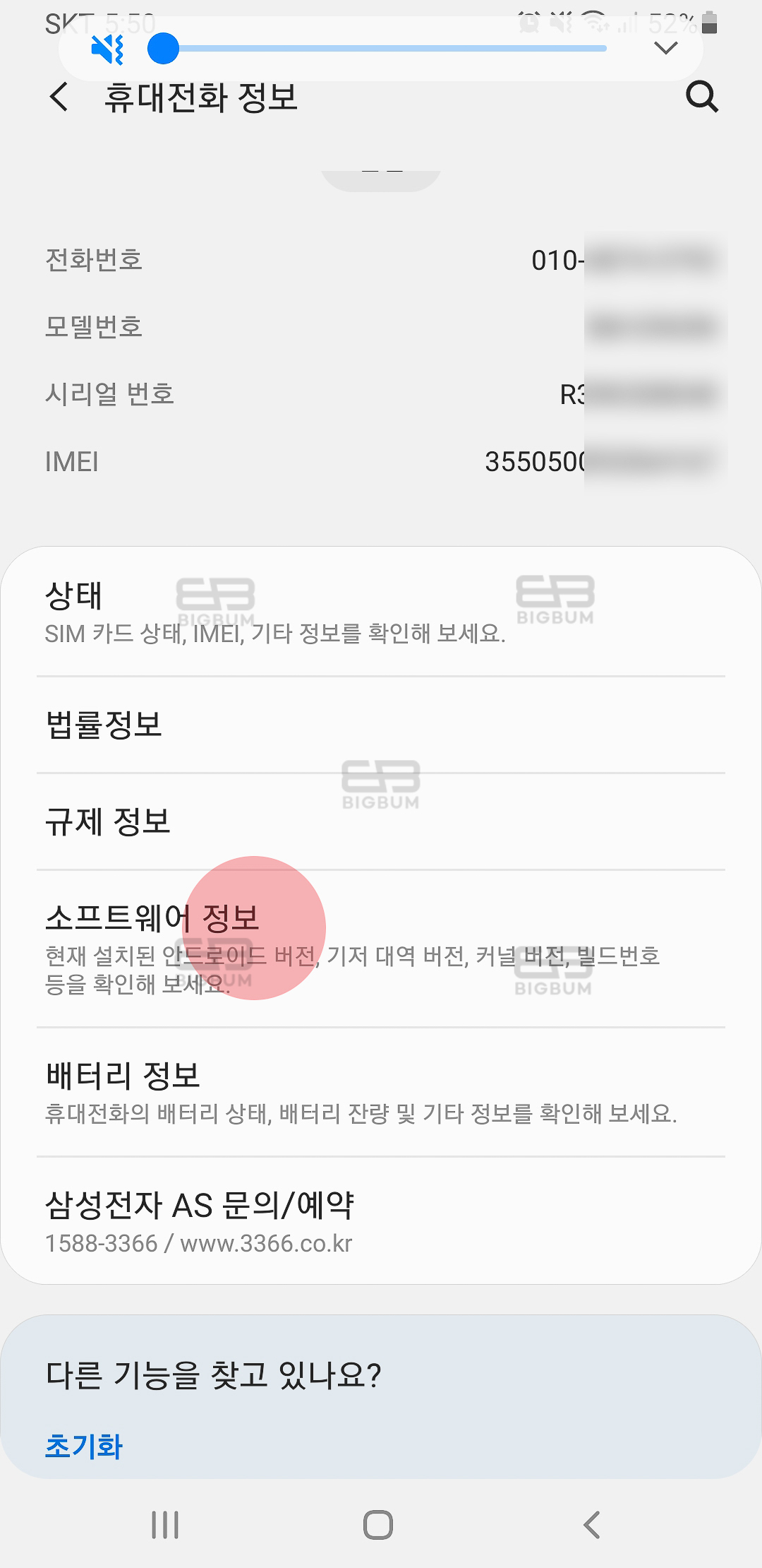 ② 휴대전화 정보 화면으로 이동하면 규제정보, 상태, 단말기 모델, 전번 등 다양한 정보가 나오게 되는데, 여기서 중간에 위치한 '소프트웨어 정보'를 터치하여 이동한다.