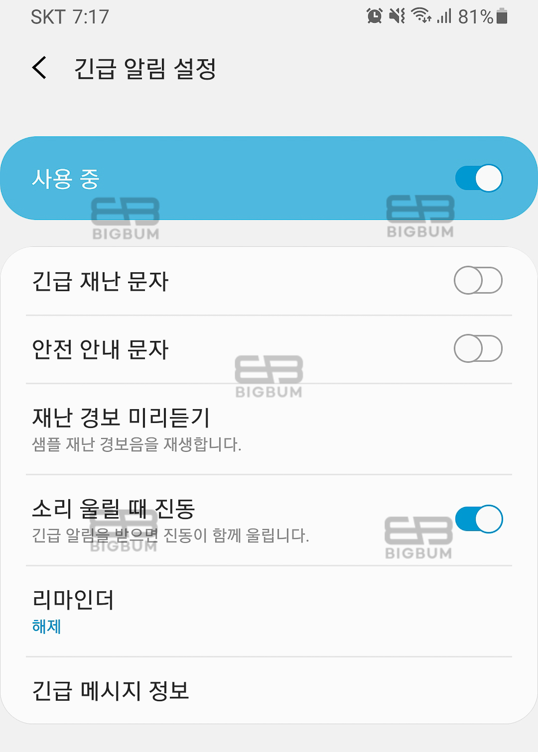 클릭을 하면 아이콘이 비활성화 되면서 매번 왔던 긴급 재난, 안전 안내 문자 메시지가 오지 않는 것을 확인할 수 있다. 알림 해제하는 것은 아무래도 안전불감증에 직결될 수 있으니 권하지 않지만, 특별히 불편함이 있을 때 본 내용을 참고하여 알림을 끌 수 있도록 하자.