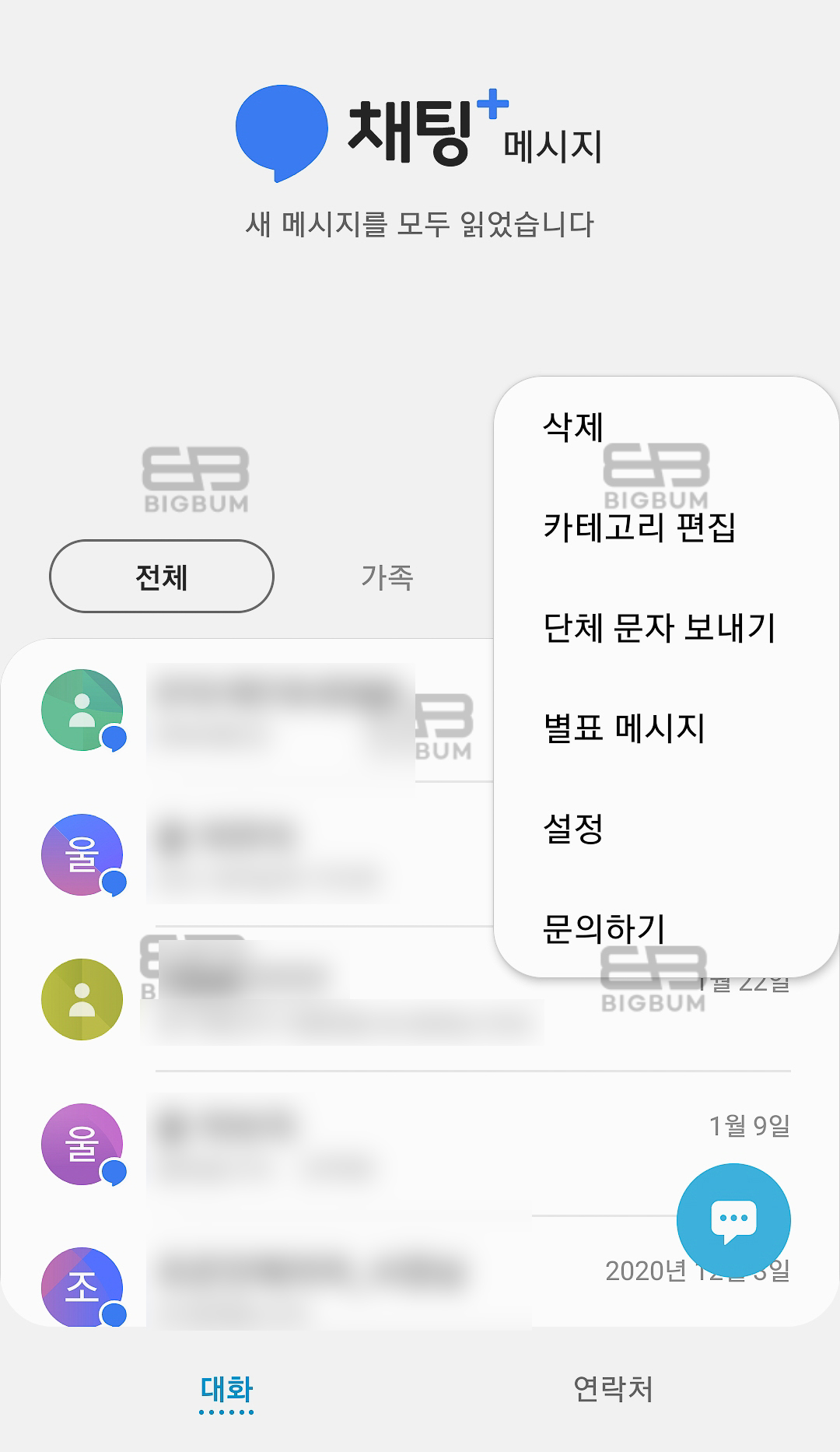 ② 삭제, 카테고리 편집, 별표 메시지, 단체문자 보내기, 문의하기, 설정 메뉴가 보이는데 이중 '설정' 메뉴를 클릭한다.