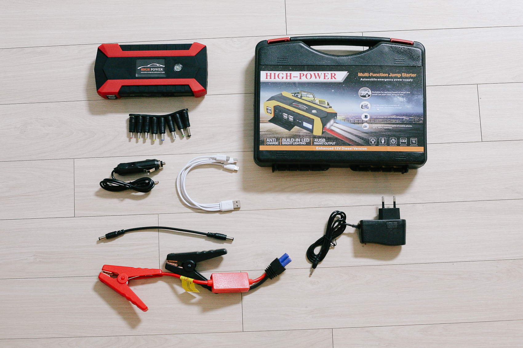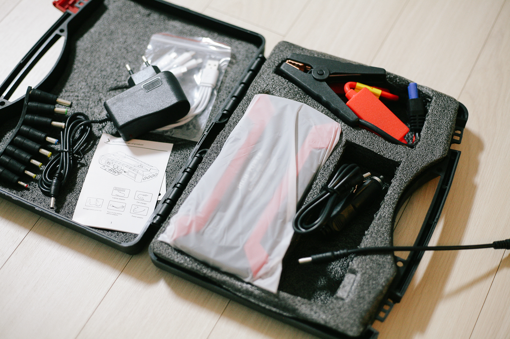 본체, 가정용 충전 어답터, 배터리 클립, 공구함, 차량용 충전기, 노트북 케이블, 노트북 전환 케이블, 다용도 USB 케이블