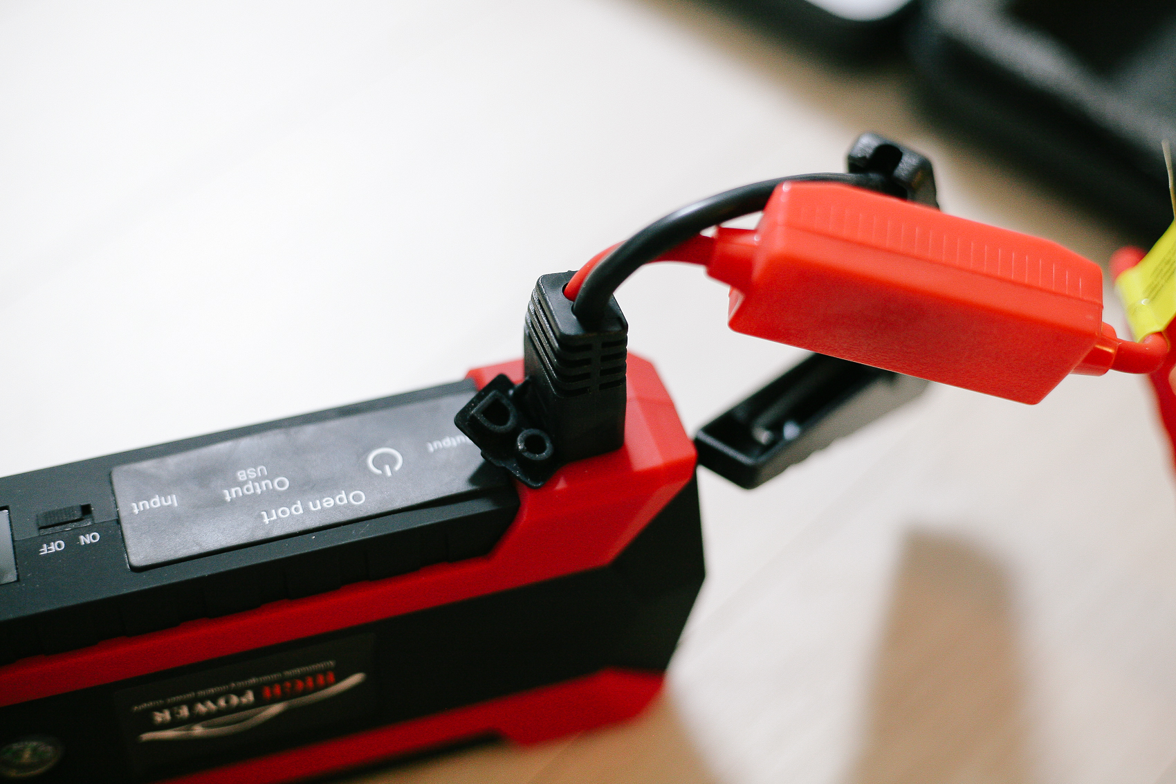 제품을 구매하는데 가장 주요가 됐던 기능. 바로 자동차 배터리 방전시 시동을 걸기 위한 점프 스타터 기능! 자동차 그림이 표시된 실리콘 커버를 열면 배터리 클립을 연결할 수 있는 구멍이 있다. 이곳에 배터리 클립 연결 부분을 꽂아 자동차 배터리 +,- 극에 맞게 물려주면 된다.