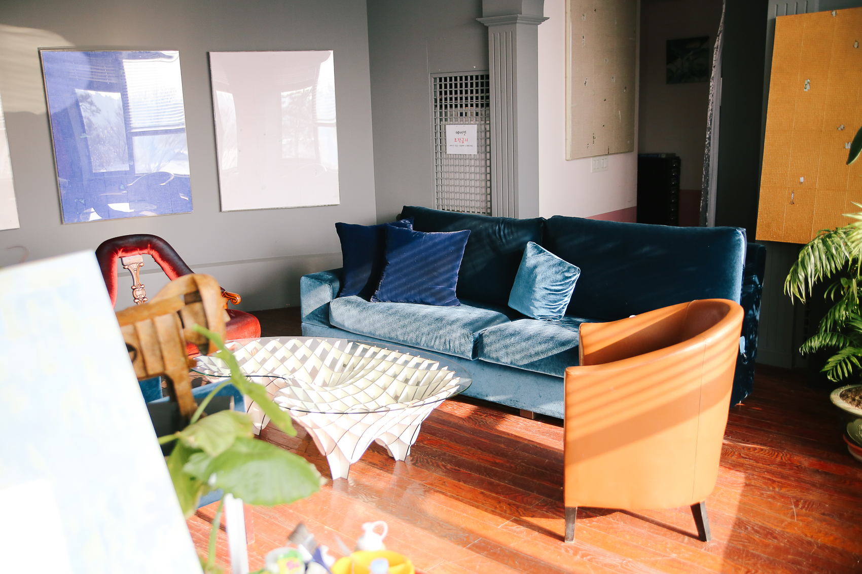저번에 변화된 공간은 그대로 테이블이 자리했고, 유화물감으로 그린 인물화가 몇점 있었다. 식물 화분이 적절하게 꾸며진 플랜테리어 역시 그대로였다.