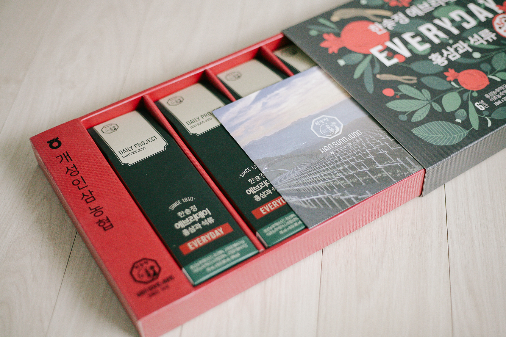 지난 연휴 때 개성인삼농협 한송정 에브리데이 6년 근 홍삼과 석류 세트를 구매했다. 홍삼과 석류의 만남이라 다소 생소하지만 호기심을 자극했고, 무엇보다 디자인 전공인 나에게 예쁜 패키지가 눈길을 사로잡아 자연스럽게 손이 갔다. ㅎㅎ
