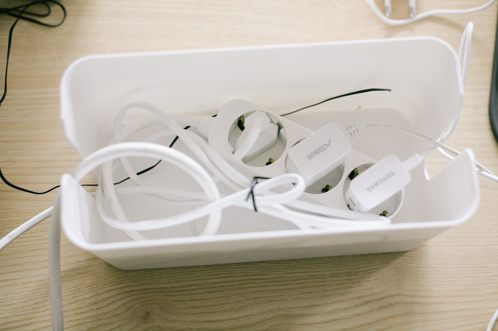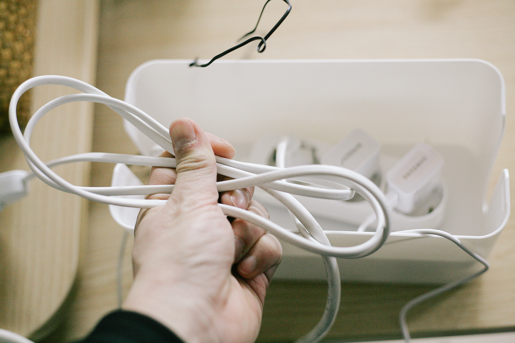 먼저 지저분하게 휴대폰 충전기, 스탠드 조명이 꽂혀 있는 멀티탭을 다용도 전선 케이블 정리 수납박스 보관함 케이스 넣어준다. 길이가 긴 부분은 검정색 철사 끈을 적절히 사용하여 깔끔하게 정리해준다.