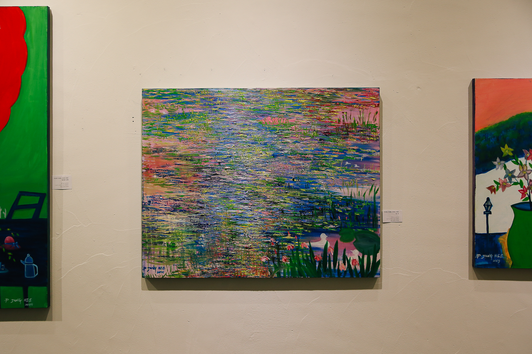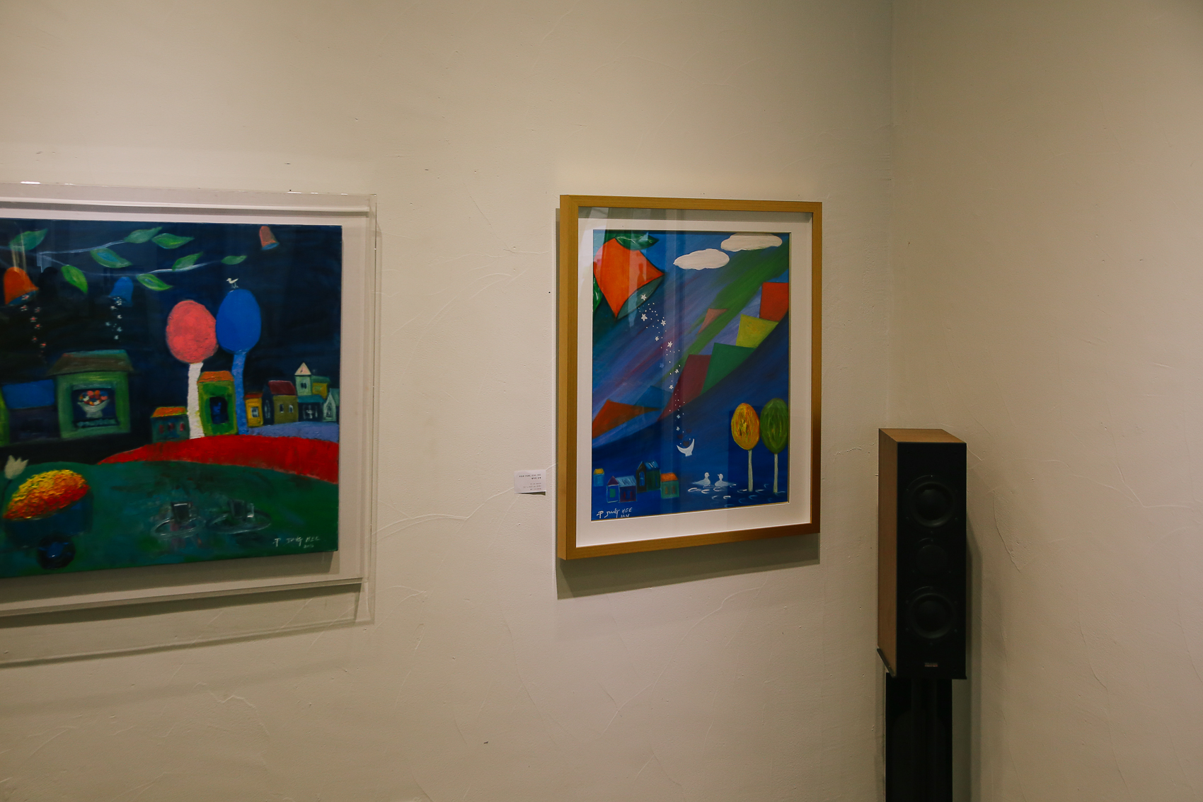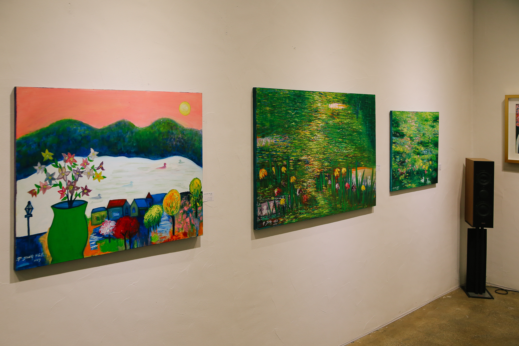 주문한 커피가 나올 때까지 잠깐동안 옆에 전시되어 있는 그림 작품을 감상하였다. 갤러리 중간에도 편하게 앉아 쉴 수 있는 자리가 있어 편하게 둘러볼 수 있었다. 지난 2월 28일까지 전시를 했던 박정희 작가의 '행복한 동행' 작품들이었다.