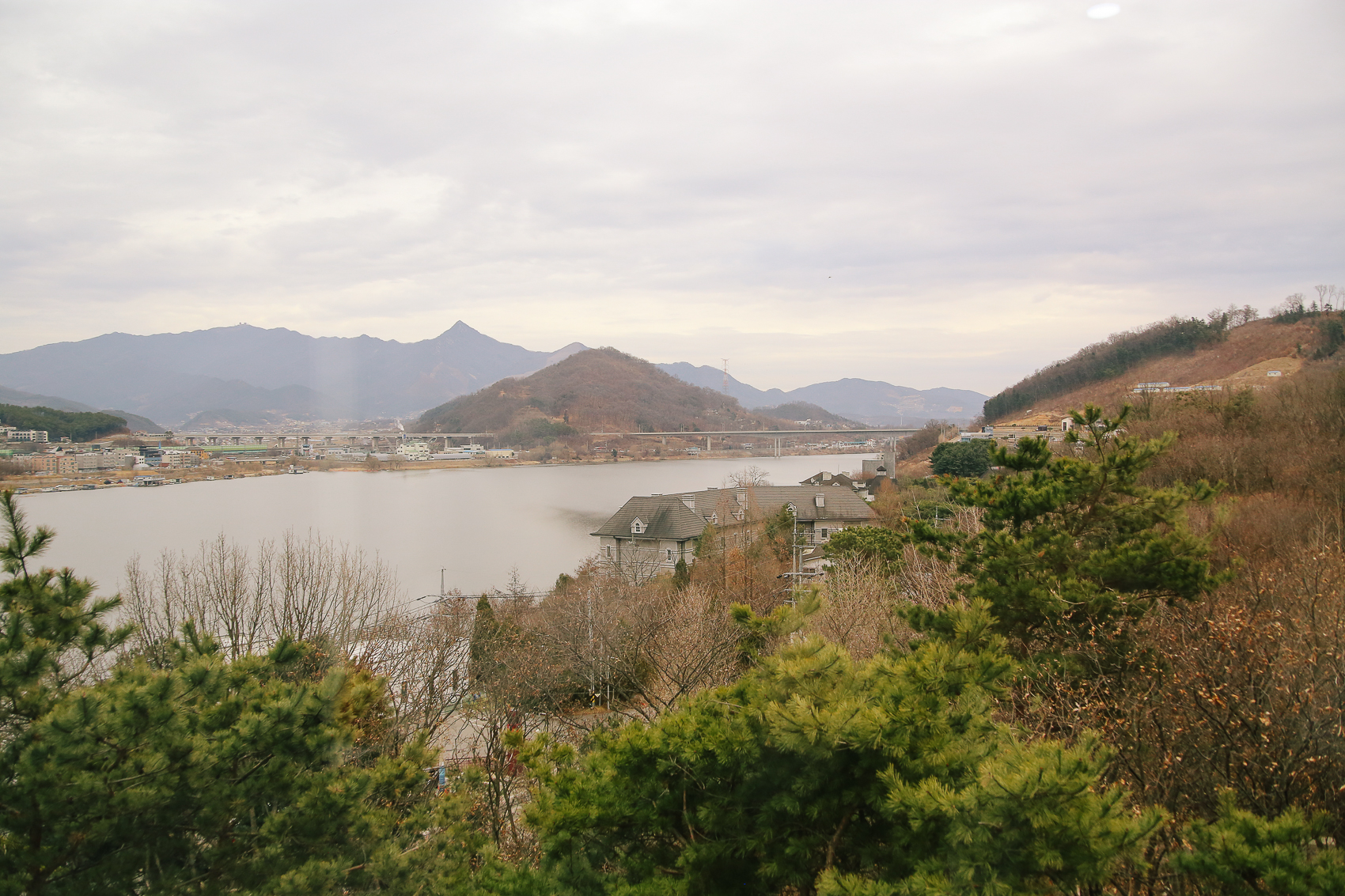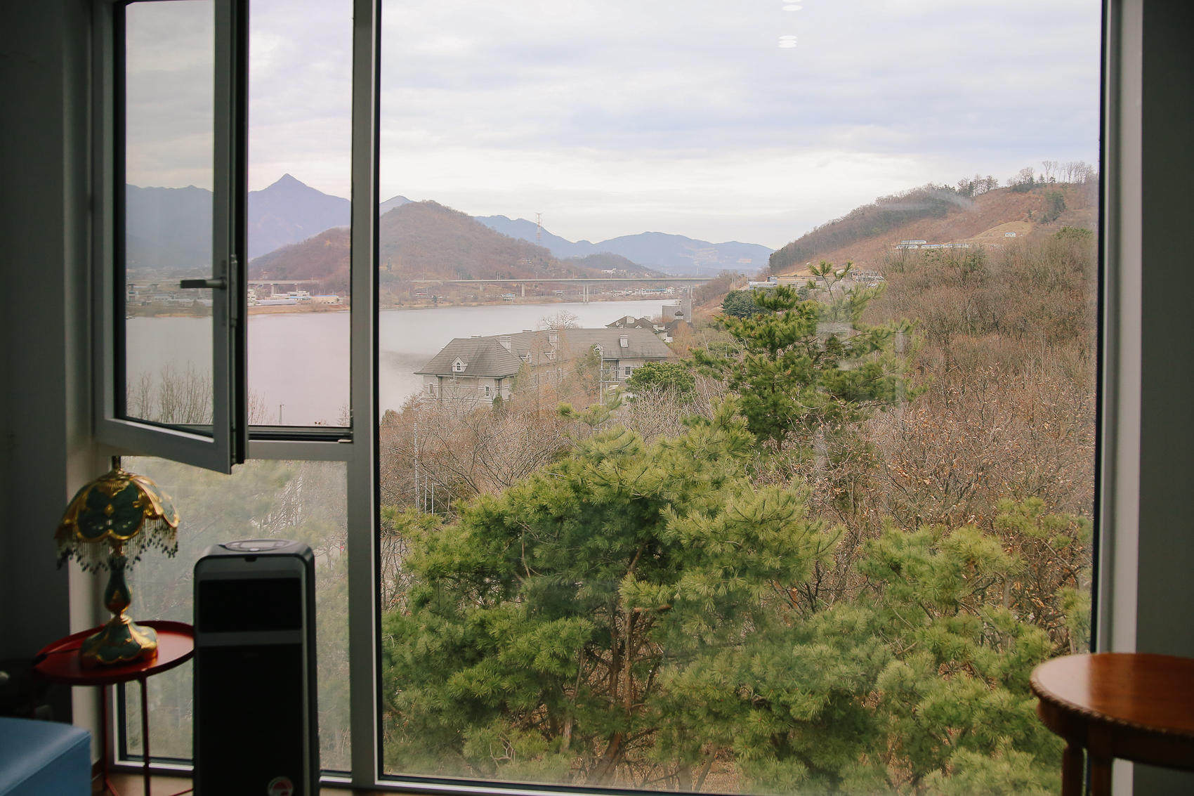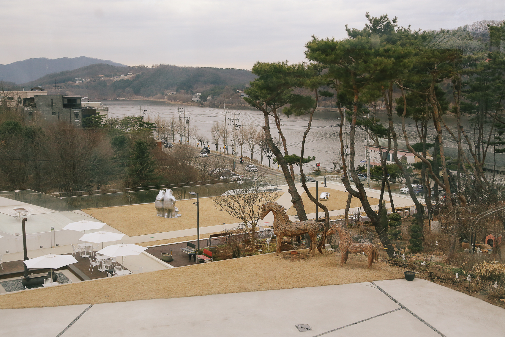 1층 갤러리에서 바라본 카포레 전경. 멀리 남한강뷰도 매력적이라고 할 수 있다. 볕이 없는 흐린 날씨인 것이 굉장히 아쉽긴 했지만 그래도 가끔씩 콧바람을 쐬며 머리를 식힐 수 있음에 감사함을 느꼈다!