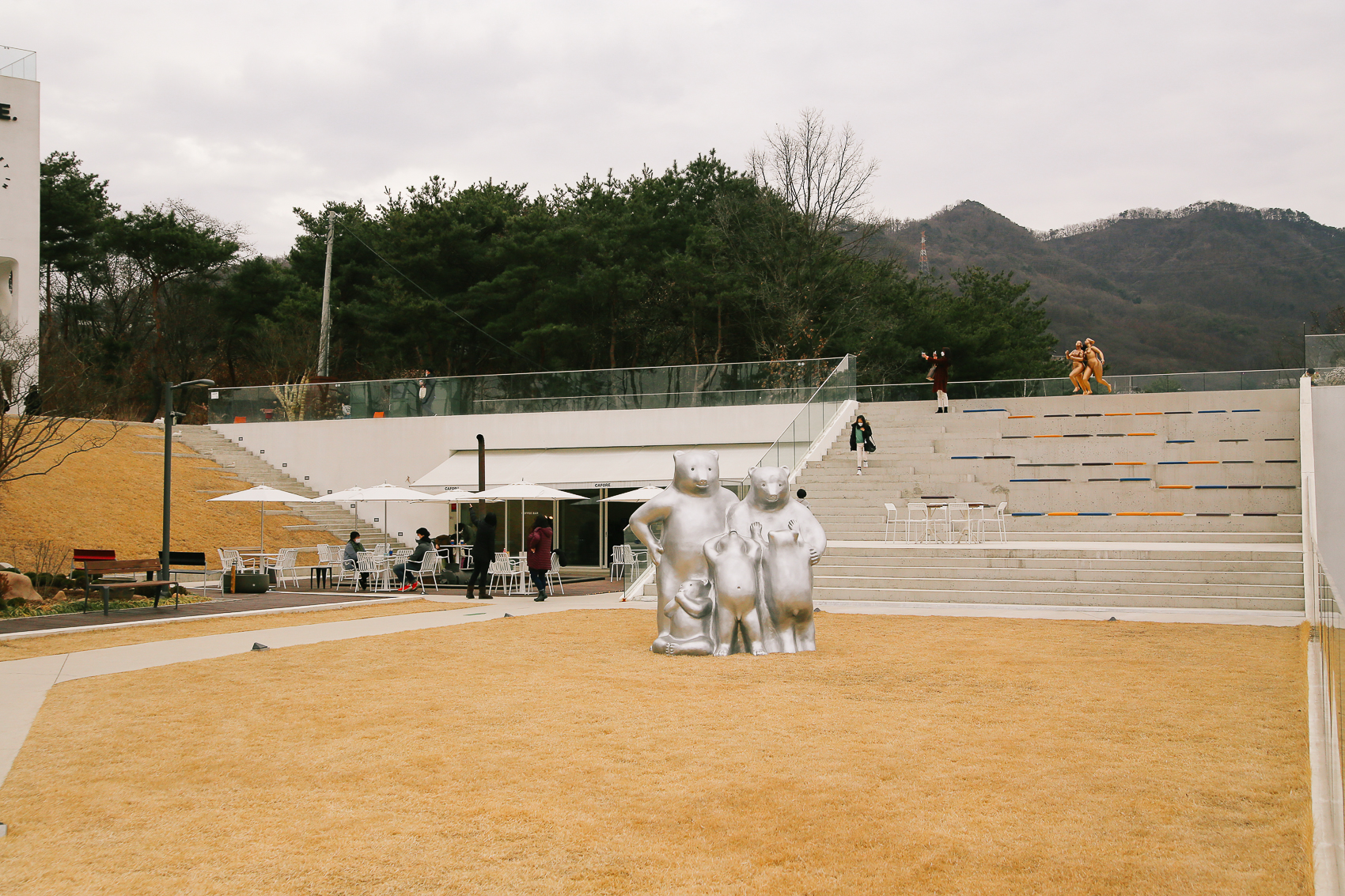 카포레 스페이스를 이동하는 중간에 다양한 조형물 조각상이 있었다. 조형물은 조각가 고정수의 개인전 작품으로 동글동글 귀엽게 표현된 사람과 귀여운 곰 조각이 꽤나 인상적인 작품이었다.