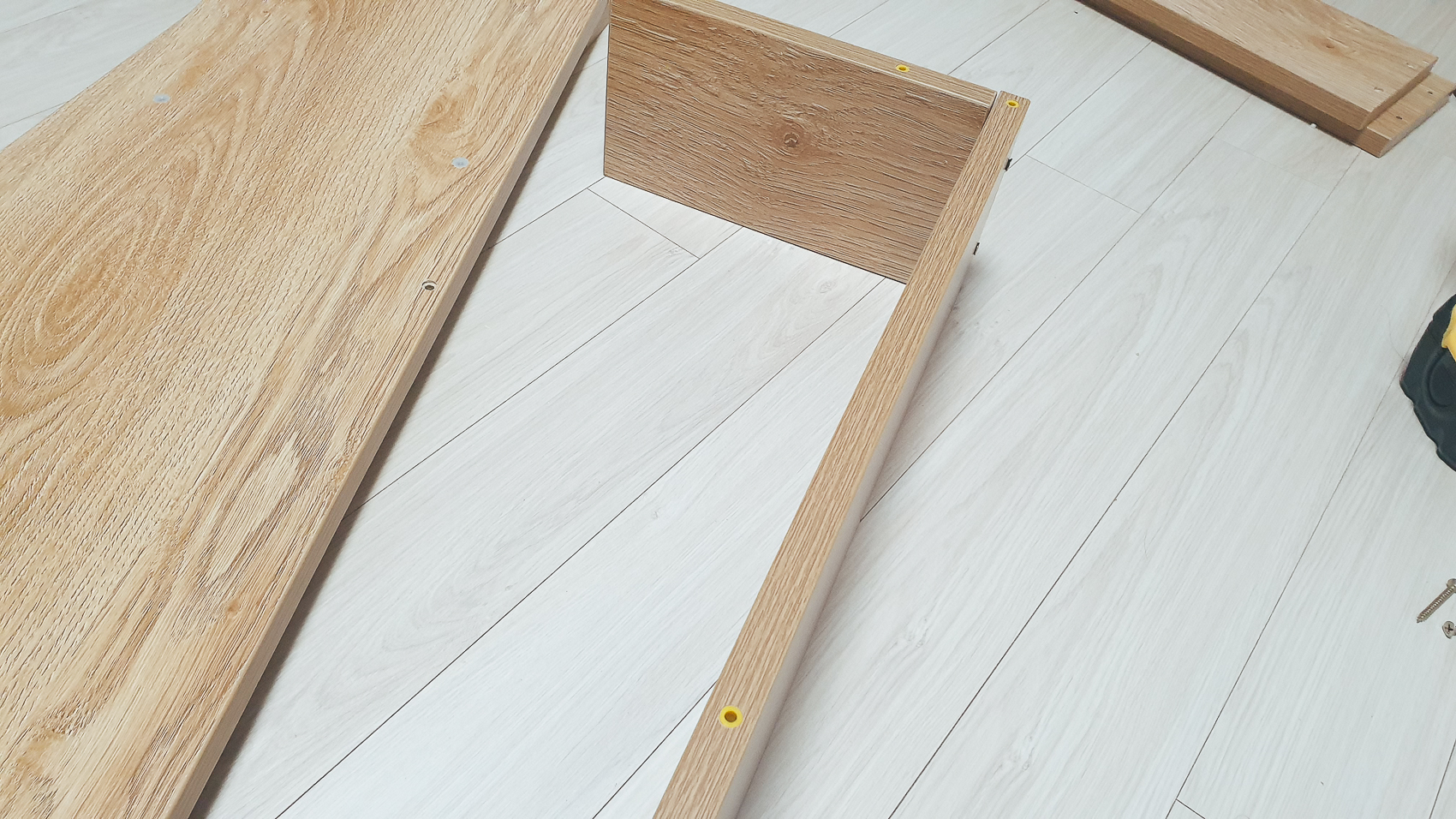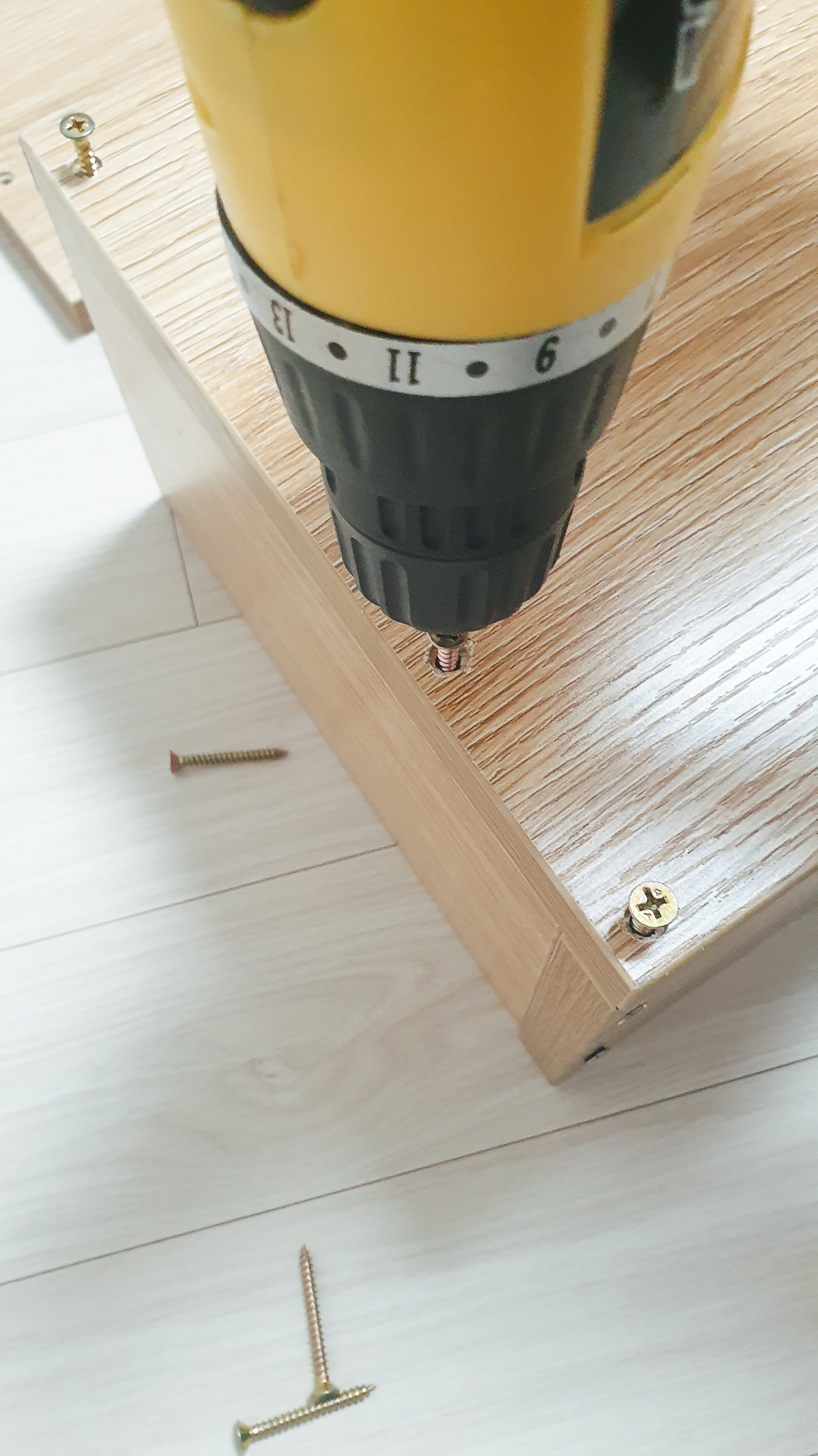 수납 선반을 총 5개를 조립해야하는 단순 작업. 수납 선반 조립 시 피스가 뚫려 있는 면을 잘 확인하여 측면, 뒷면, 바닥면을 잘 조립해준다. 그리고 처음에 세게 조이지 말고, 각 피스 구멍에 자리를 잡아준 다음에서야 꽉 조여주도록 하자.